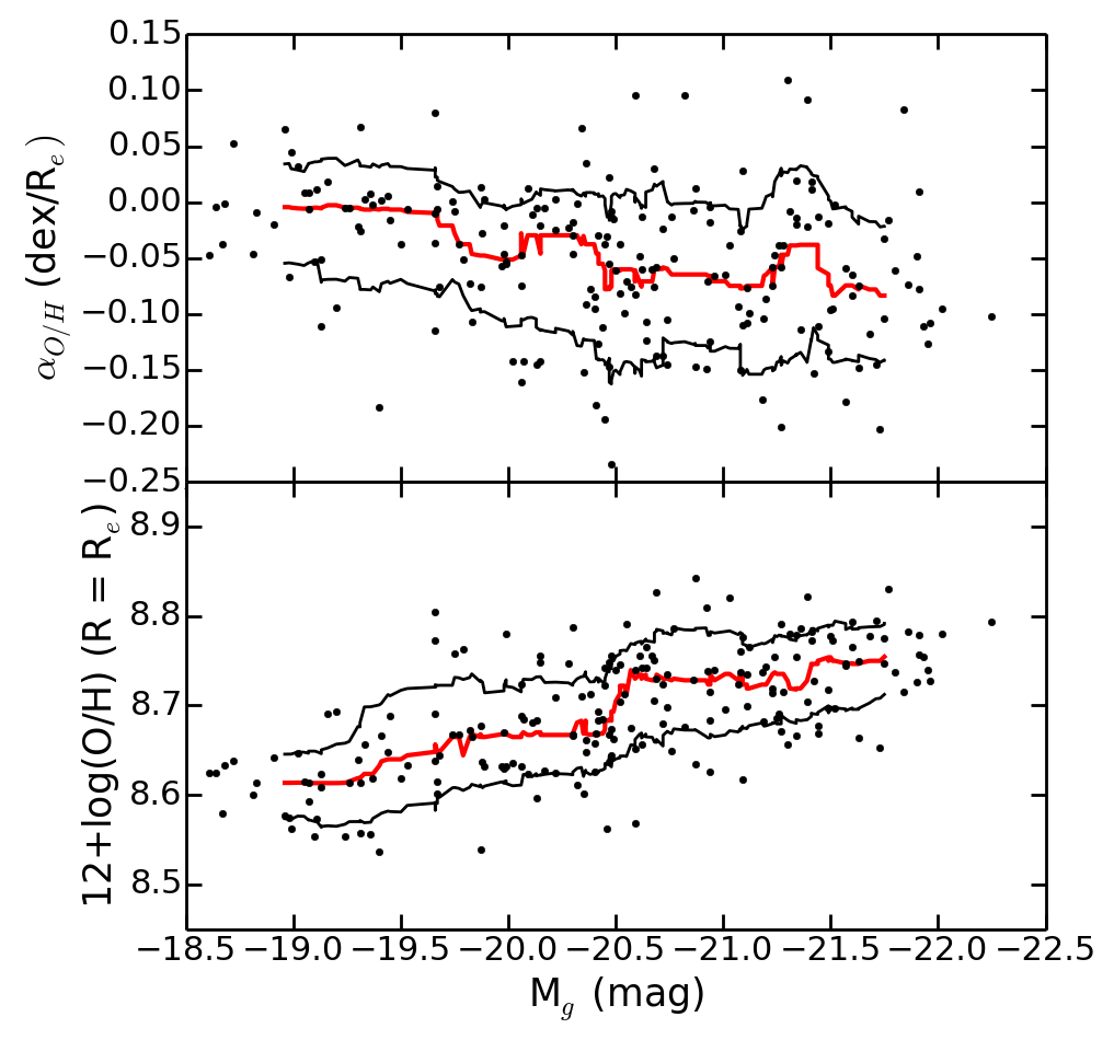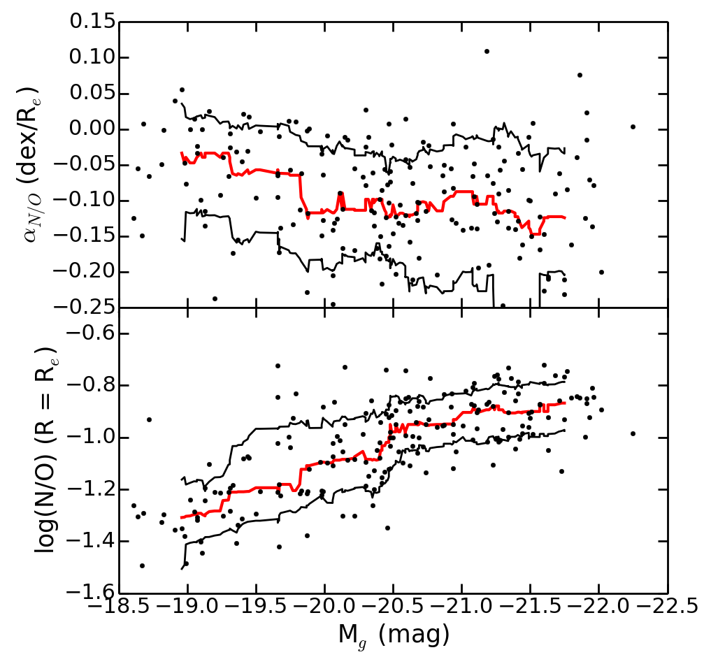 Relation between the absolute luminosity in the g band and the derived slopes and characteristic values at the effective radius for O/H (left panels) and N/O (right panels). The red solid line represents the running median for bins of 25 objects, and the black solid lines the 1σ above and below the averages in the same bins.