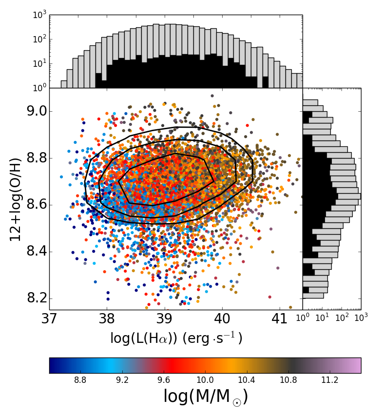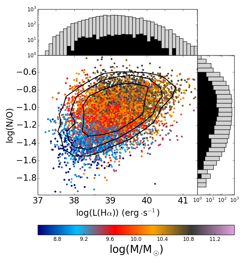 Relation between the Hα luminosity and O/H, at left, and N/O, at right, for the selected H ii regions of the galaxies for which a linear gradient was calculated. The colour encodes the total stellar mass of the galaxy where each H ii region is situated. The histograms show in logarithmic scales in all axes the distribution for all objects represented in the plot (white bars) and for those H ii regions in a galaxy with an inverted gradient (black bars). Colours indicate the density of points and solid lines represent the 1σ, 2σ, and 3σ contours.