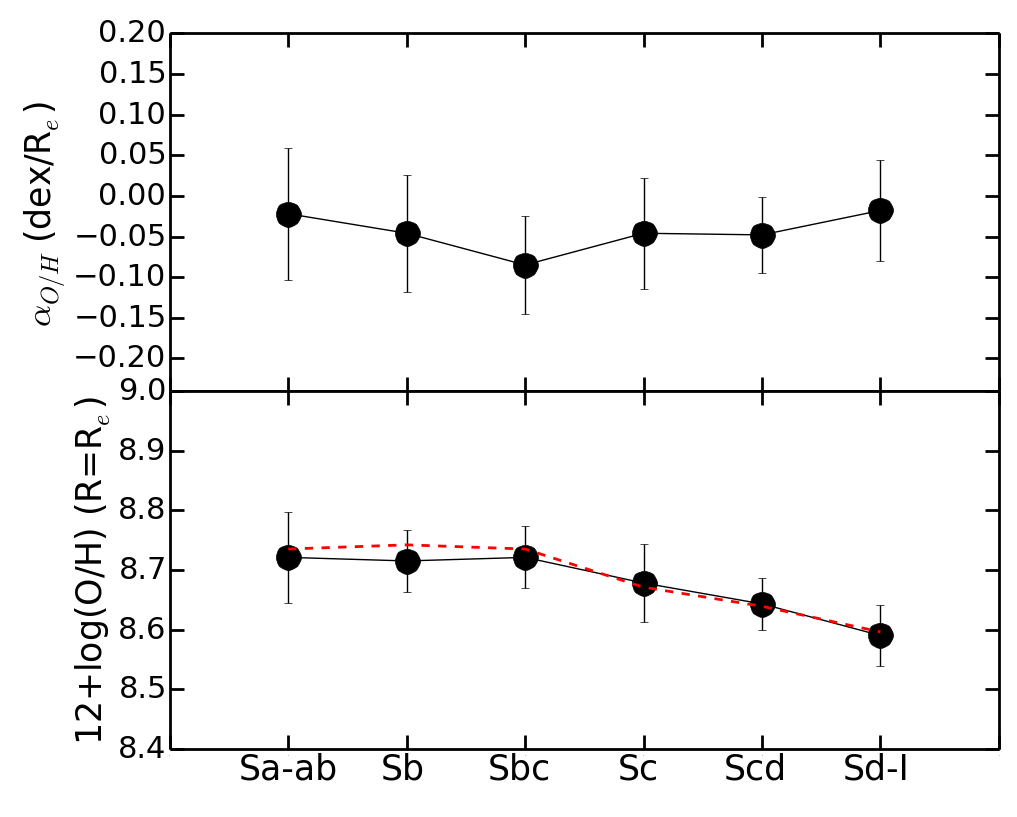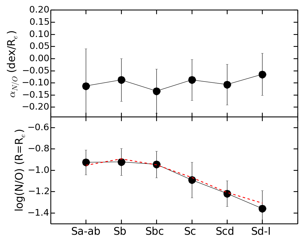 Average slopes and value at the effective radius of the linear fittings in the non-interacting analysed galaxies as a function of the morphological type for O/H (left panels) and N/O (right panels). The black solid lines connects the average points for each morphological type, while the red dashed lines correspond to the average typical abundance ratios found at the average stellar mass of each type.