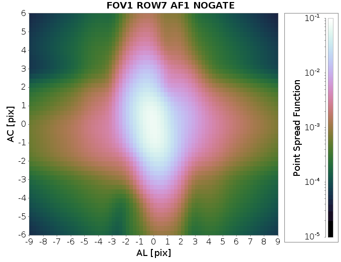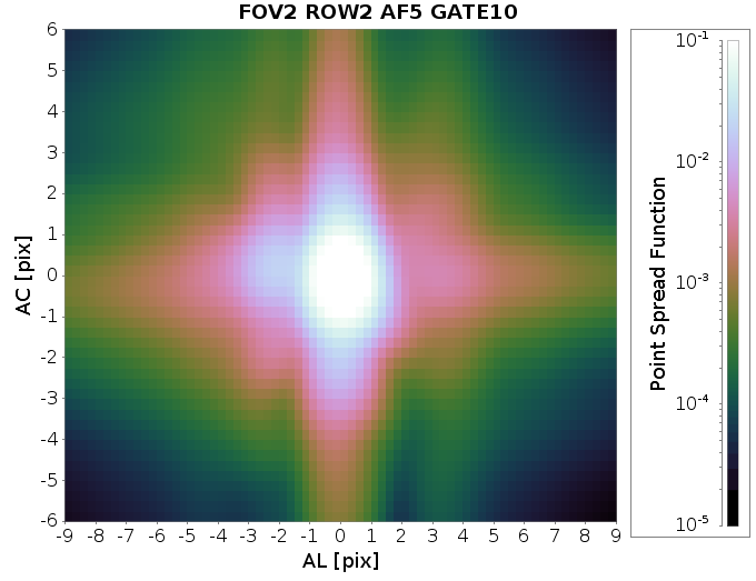 Examples of the PSF for the devices with the smallest (93.1 mas) and largest (132.4 mas) AL FWHMs. The largest FWHMs are in devices in one corner of the focal plane (AF1/2 in rows 6 and 7), while the smallest FWHM is close to the centre (AF5, row 2). The longer gates usually have larger FWHMs in the AL profile due to the variation in the PSF along the CCD. We also see here the effect of the greater AC smearing in the ungated PSF profile.