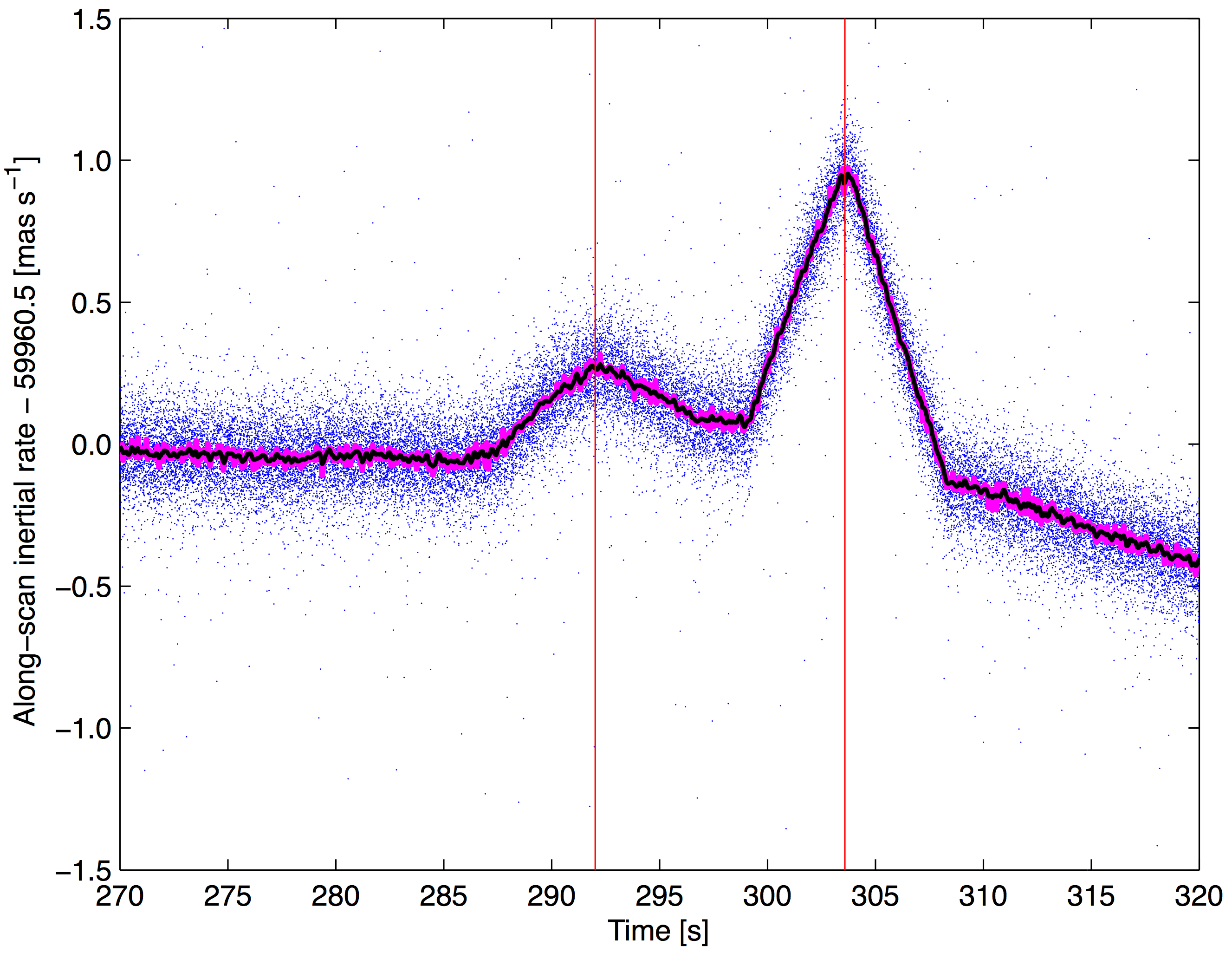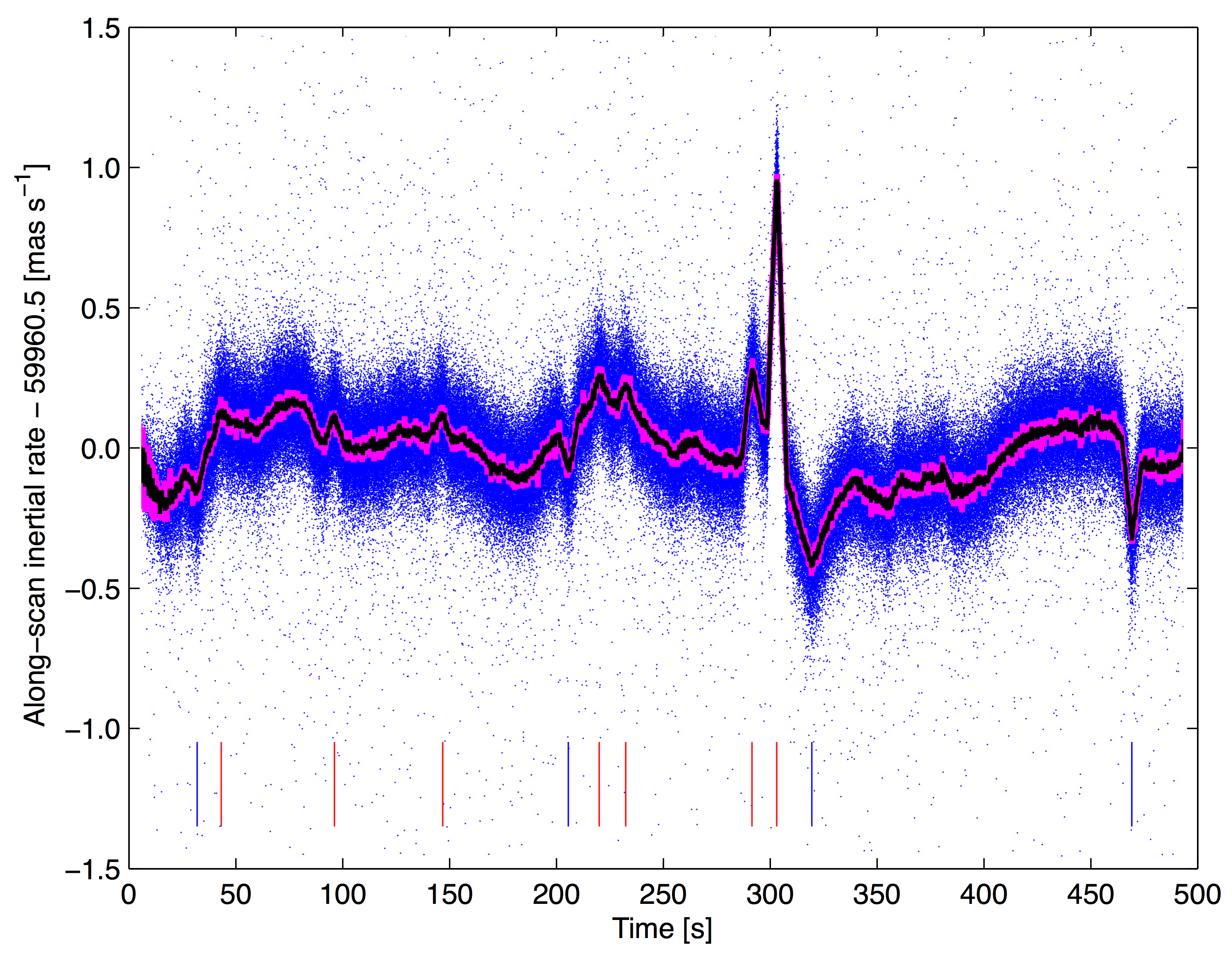 Top panels: examples of micro-clanks in the AL TGAS residuals during a time interval of 500 s (left) and a subinterval of 50 s (right). The vertical lines show the times of the micro-clanks as estimated from rate data (red/blue for positive/negative jumps). The attitude knot interval is 30 s, which sets the typical period of the wiggles seen between the micro-clanks. In the top right panel, filled blue dots are ungated observations and open red circles are gated observations. The shorter integration time of the gated observations gives a steeper slope of the residuals around the micro-clanks, as can be seen, for example, by comparing the open red circles and filled blue dots around the jump at 303 s in the top right panel. Bottom panels: AL inertial angular rates estimated from successive ungated CCD observations of a much larger number of faint (~15 mag) stars. Individual rate estimates are shown as blue dots. The thick magenta curve shows the median rate estimate in each bin of 0.045 s duration. The black curve is a 5-point running triangular mean of the medians, added to better show the rate variations. The vertical lines at the bottom of the diagram show the estimated times of the micro-clanks detected by means of a simple matched filter.