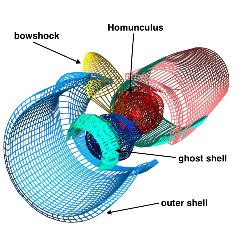 Three-dimensional model of η Car’s outer ejecta seen from Earth (left) and from the side (right) with the bipolar Homunculus nebula in the center (dark red and blue lobes). The model has been constructed with SHAPE and the Hβ emission and velocity (over a range of ± 3000 km s -1) information extracted from the MUSE data. The outer ejecta form a partial bent cylinder. The open cylinder parts are not observed in the MUSE data, i.e., we only trace the bottom of the shell moving toward us and the top of the shell moving away from us. The open cylinder parts are likely too faint, perhaps due to only weak interactions with less dense surrounding material. This large tube is probably bent or indented due to material being slowed down by interactions with the environment. The ghost shell (green) is in our line of sight to the southern Homunculus lobe and consists of two closely aligned shells. An additional half-shell (green mesh, complementing the bottom of the large cylindrical shell moving away from us) lies behind the northern Homunculus lobe. The bowshock-like feature is displayed in yellow. The colors are selected to distinguish the different shapes selected for the SHAPE modeling.