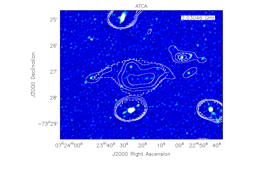 Contours of the ATCA tapered image centred at 1.867 GHz are overlaid on the ATCA wide-band tapered (left) and full-resolution maps (right). Dashed contours correspond to the islands of significant emission detected by PyBDSM on the Block 3 tapered map (cyan contours in Fig. A.1). The continuous curves trace instead “classical” 3, 3