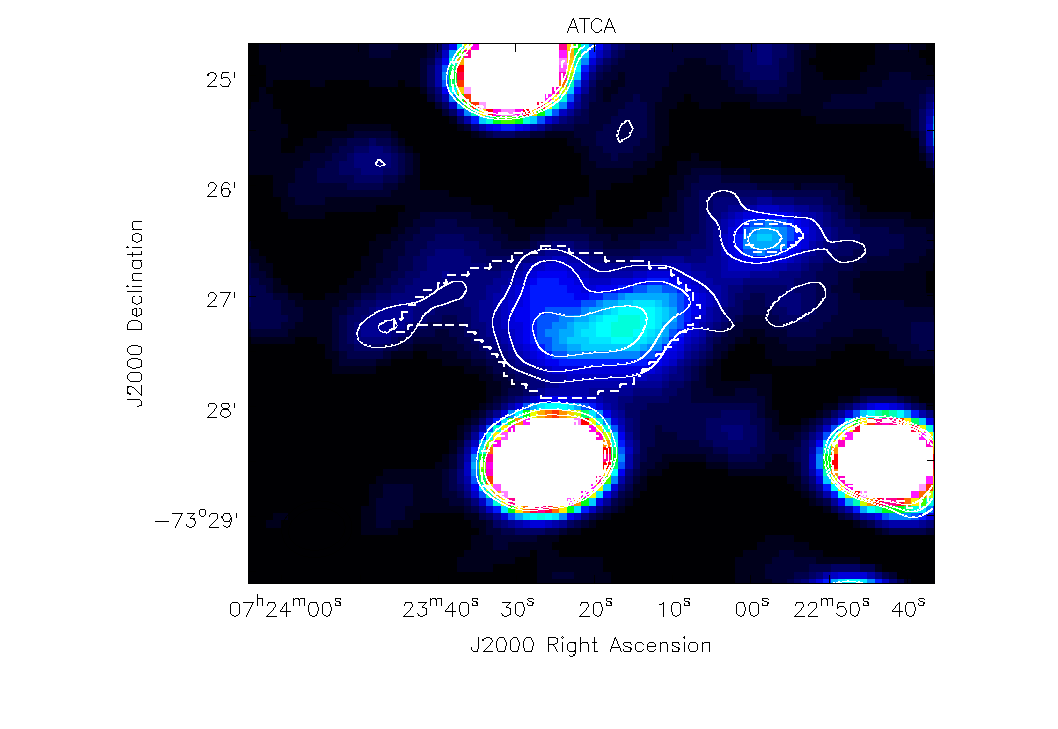 , 6σ contours (i.e. with the 51.1 μJy/beam rms value of the map estimated by hand on the Block 3 tapered map at ~30 arcsec resolution; see Table 2).