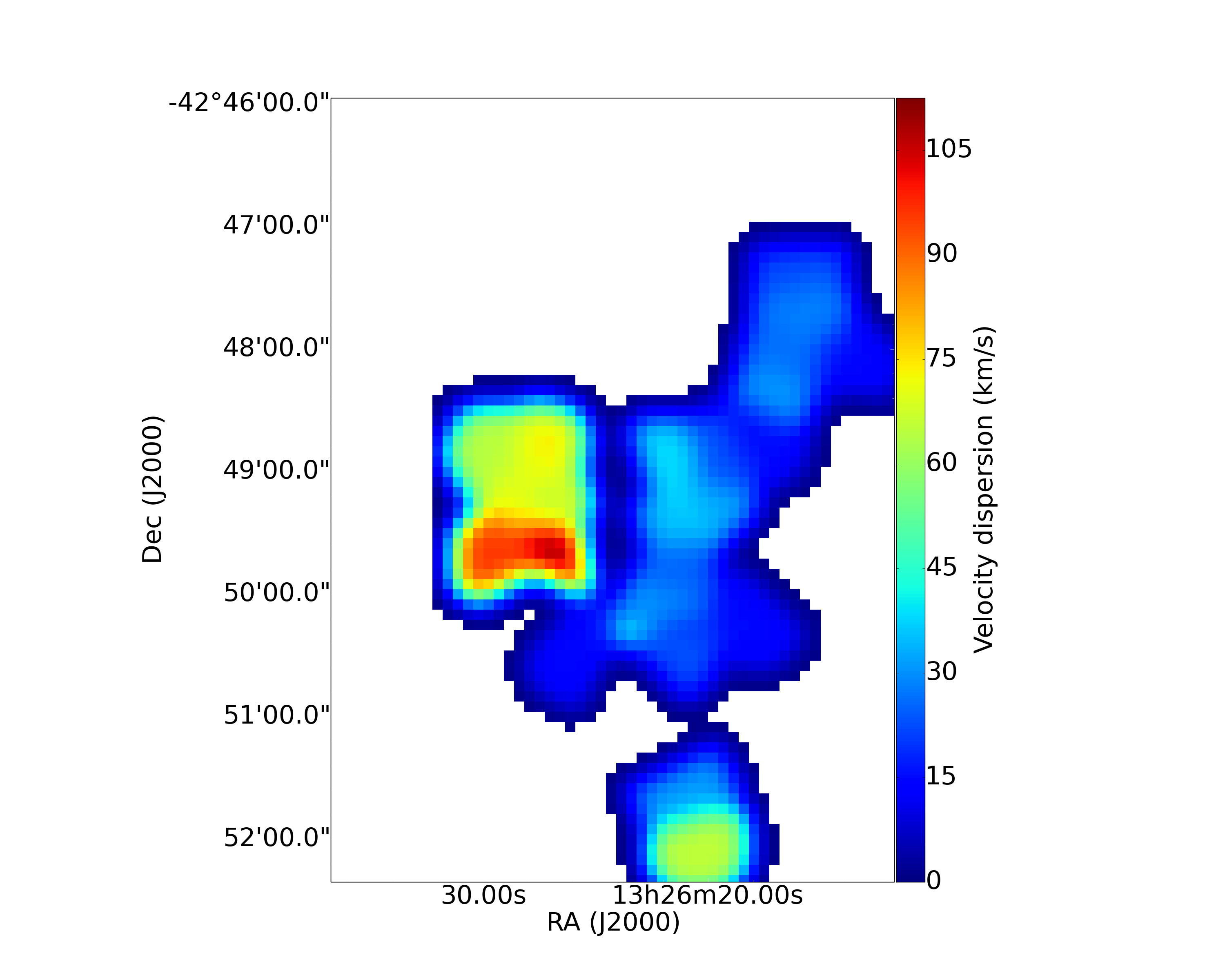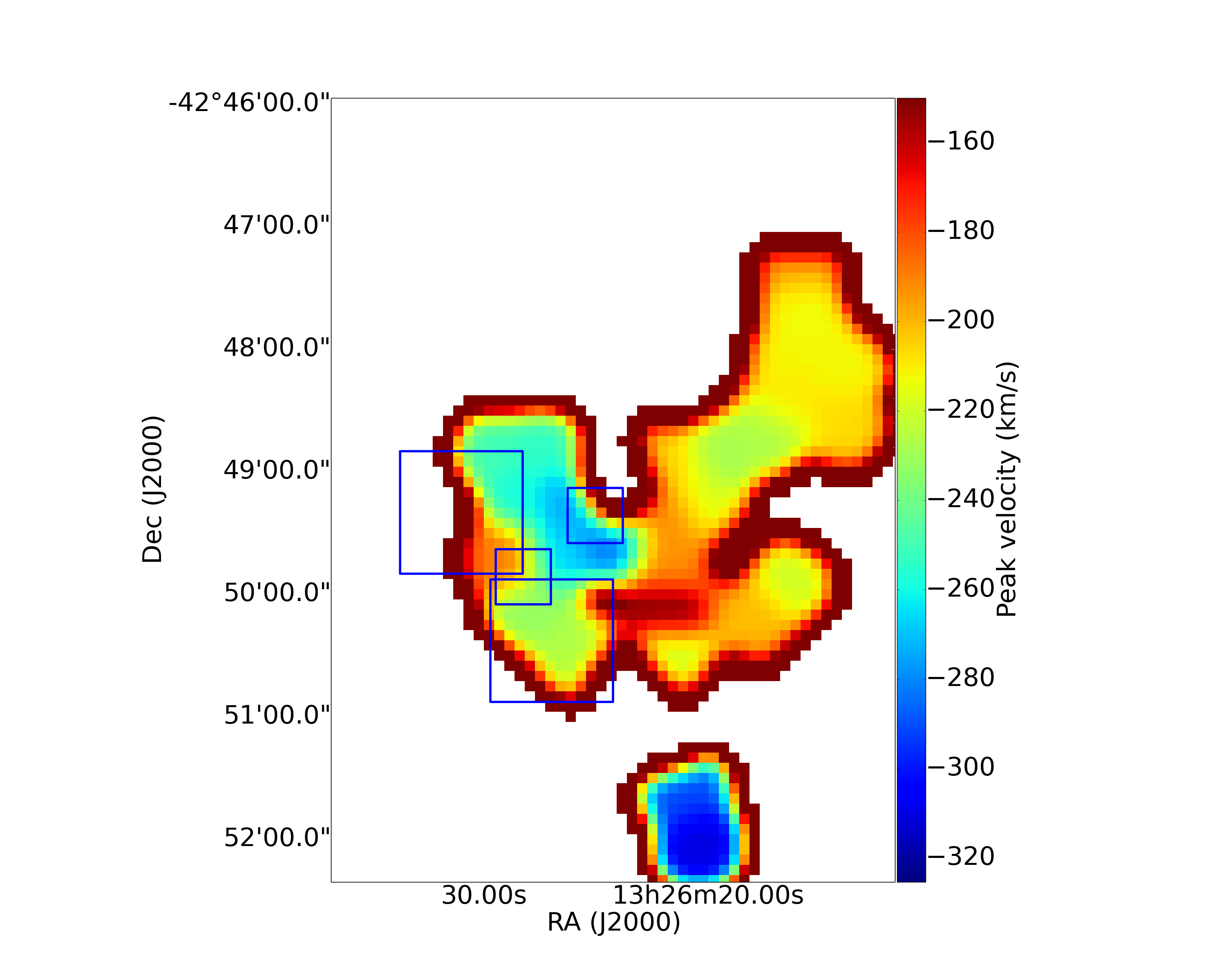 Peak velocity (left) and velocity dispersion (right) map of the CO(2−1) emission from APEX. The velocities are relative to the systemic 547 km s-1 value. In the left panel, the boxes represent the fields of view observed with VIMOS (small; Santoro et al. 2015a) and MUSE (large; Santoro et al. 2015b).