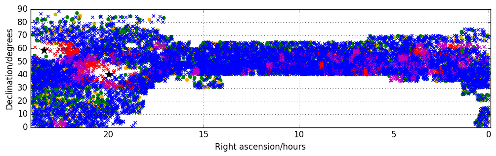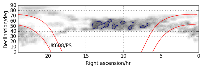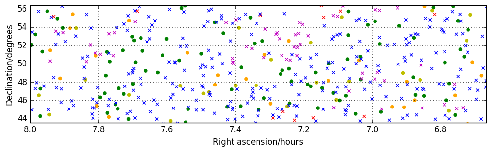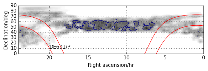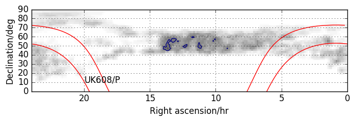 Top left: current sky coverage of LBCS. Over subsequent observing seasons, the intention is to fill in gaps or areas where the observations were poor (see Sect. 3.6), as well as to extend the survey below 30°N by selection from the MSSS survey. Top right: an expanded plot of a small region of sky. In both plots, green circles represent sources for which all, or all but one, observing stations gave P-class delay and phase solutions; greenish-yellow circles those for which all but one station gave P- or S-class solutions; and orange circles those for which all but two stations gave P- or S-class solutions. Blue crosses represent sources where the sources are likely not to be suitable as long-baseline calibrators. Purple and red crosses, respectively, represent the cases that are not detected on long baselines but the data is possibly, or definitely, faulty. Middle/lower: contour plots of average density of calibrators, greyscaled from 0−2 per sq. deg and with a contour at 1 per sq. deg. Middle: calibrators with correlated flux density between Effelsberg (DE601) and the phased core (ST001). Lower: the same for Chilbolton (UK608). In each case, the left-hand plot represents the density of good (“P”) calibrators and the right-hand plot the density of good or marginal calibrators. The red lines in each plot represent Galactic latitude of ± 10°.