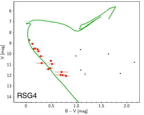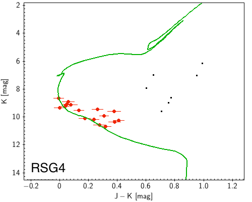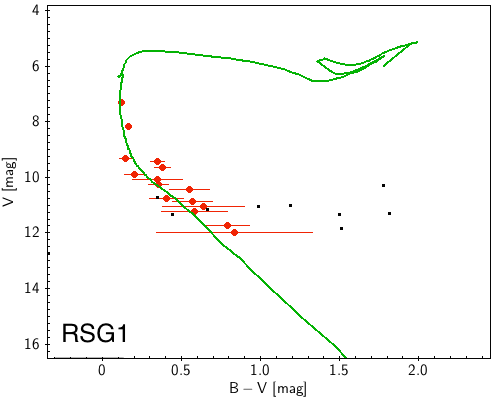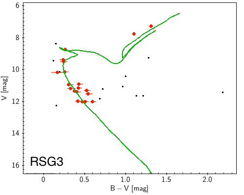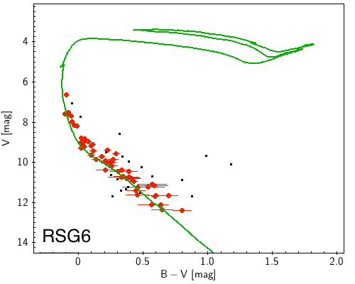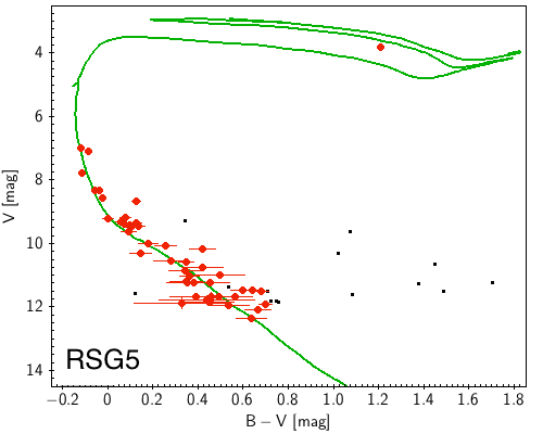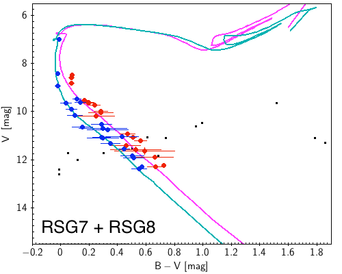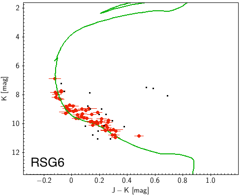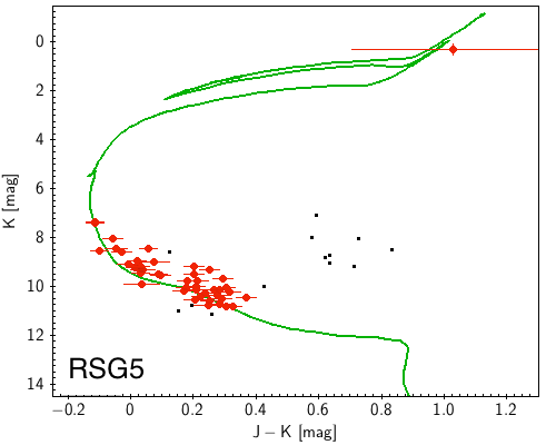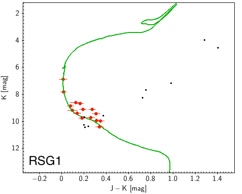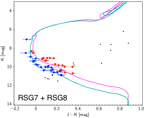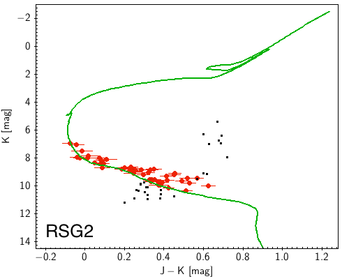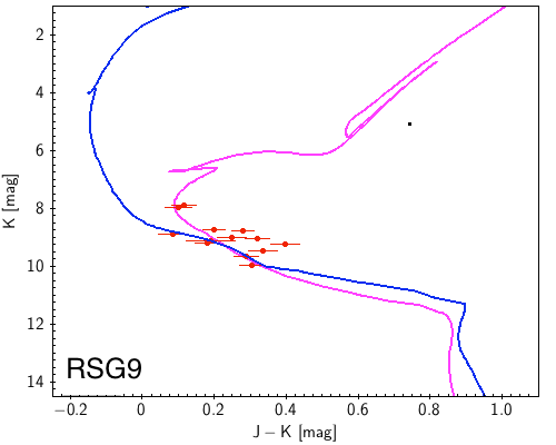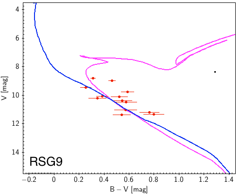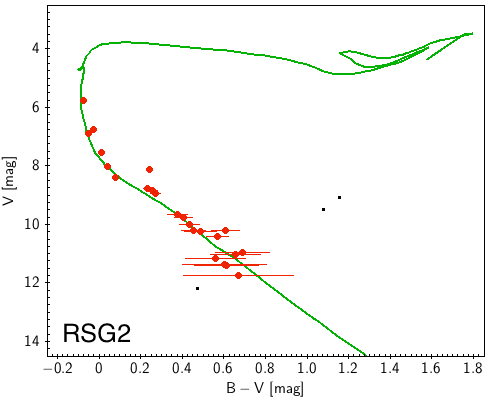 Colour−magnitude diagrams (B − V,V) and (J − KS,KS) of the clusters RSG1 to RSG9 from Table 1. Thick red (blue in the case of RSG7) dots with error bars are confirmed photometric members; small black dots are field stars within the same proper motion slice within a 2 deg radius (a 3 deg radius in the case of RSG2) around the cluster centre. Fitted Padova isochrones corresponding to the ages given in Table 1 are shown as coloured lines.