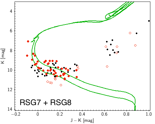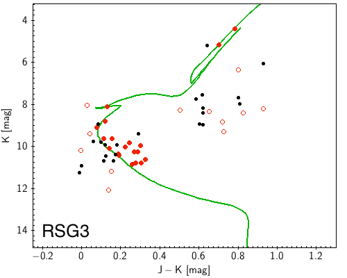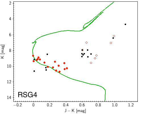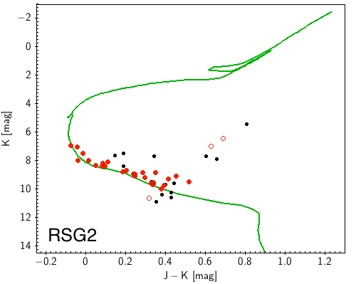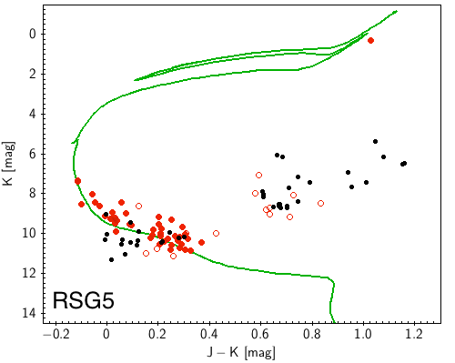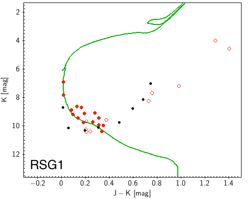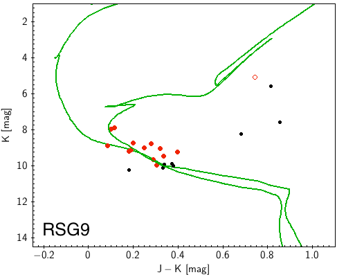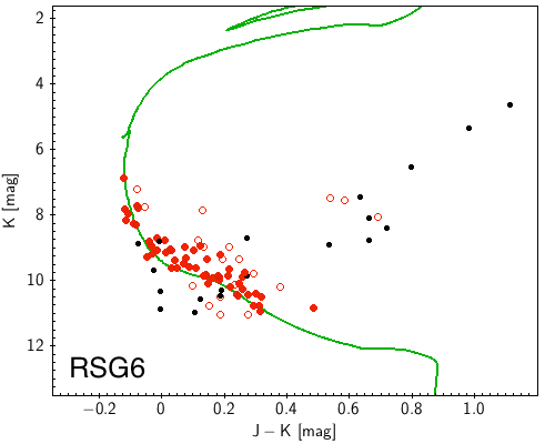 Observed and predicted (by the Besançon model) (J − KS,KS) CMDs in the areas of the clusters from Table 1. Red symbols refer to observations, where thick dots indicate probable members and circles indicate field stars. The black dots are predicted field stars from the Besançon model of the Galaxy.
