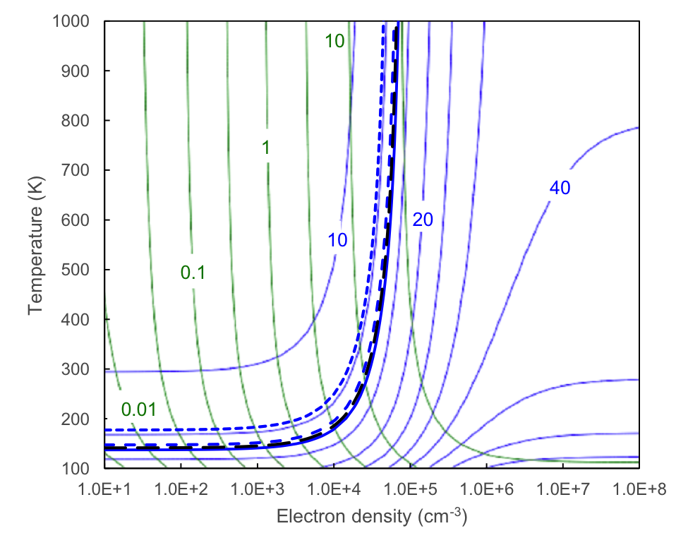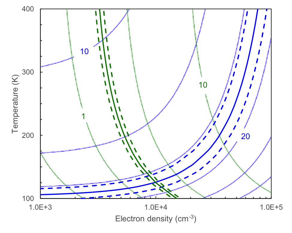 Top: observed [O I] 63.2/145.5 (blue) and [O I] 63.2/[C II] 157.7 line ratio (green) contours compared to expectations for a single-component model. The observed ratios for the regions immediately outside the FIR 3 jet are indicated with heavy solid contours, and the ±1σ band by dashed contours. Thin contours indicate the constant line ratios, covering the plotted range of density and temperature, with logarithmically-spaced contours. The families of curves intersect near ne = 104cm-3 and T = 130 K, which lie in the ranges common for photodissociation regions in the Orion molecular-cloud complex. Bottom: [O I] 63.2/145.5 intensity ratios observed along the jet plotted as heavy blue curves: FIR 4 (shortest dashes), FIR 3 (solid), SW/NE of FIR 3 (medium/long dashes). At high temperatures the intensity ratios would indicate electron density in the range 5 × 104–8 × 104cm-3.
