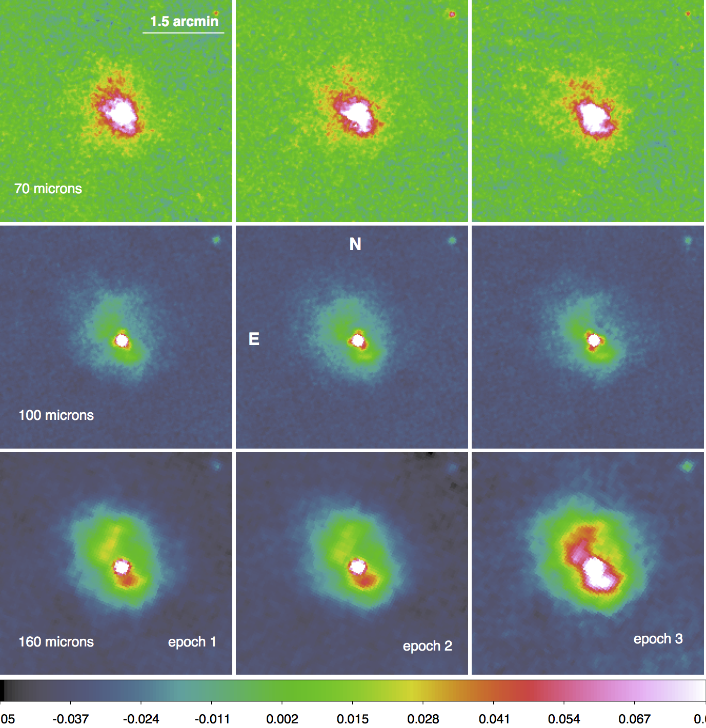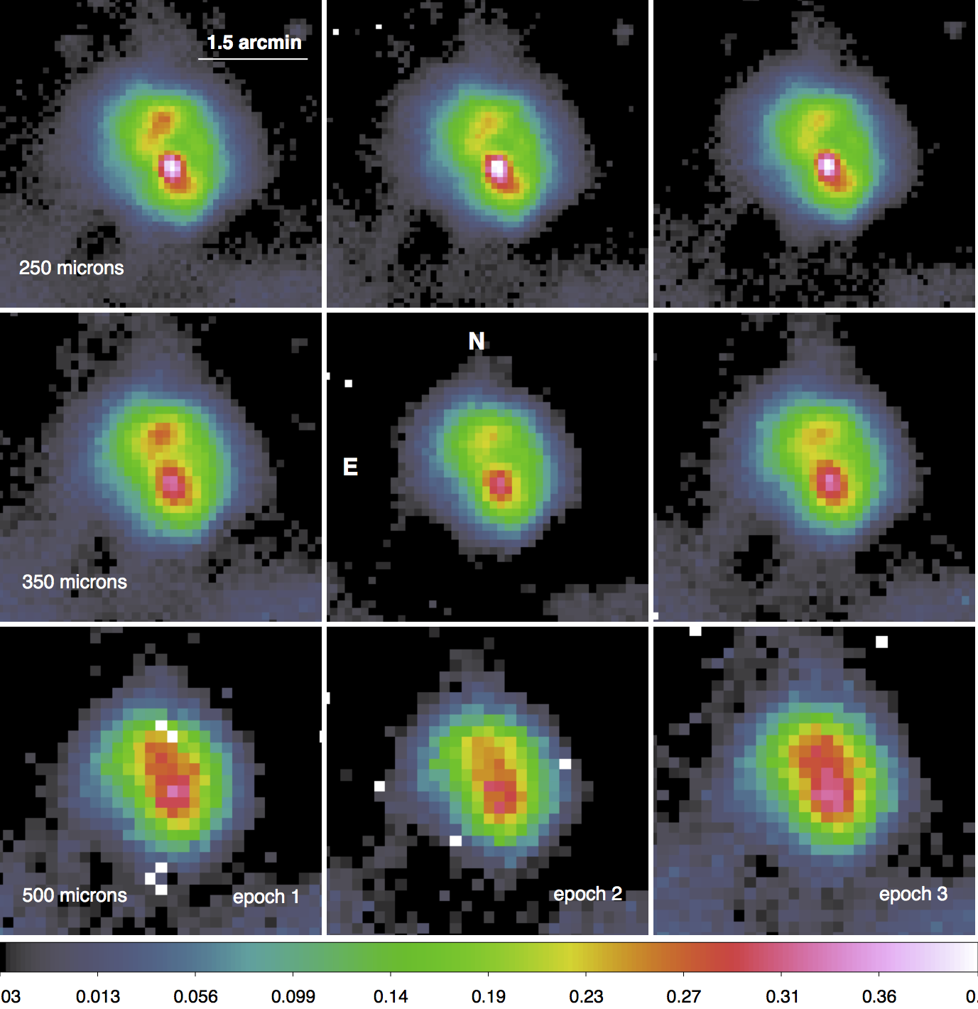 Top to bottom: PACS (top three) and SPIRE (bottom three) maps at the indicated wavelengths and epochs. The flux scaling, in increasing wavelength order, is: PACS −0.05 to 0.08/0.2/0.4 Jy beam-1; SPIRE −0.03 to 0.8/0.6/0.4 Jy beam-1. The brightest point on each map is V838 Mon; the tri-lobal shape of the PACS beam can be seen on the 100 μm maps. N–E is indicated in the central maps.