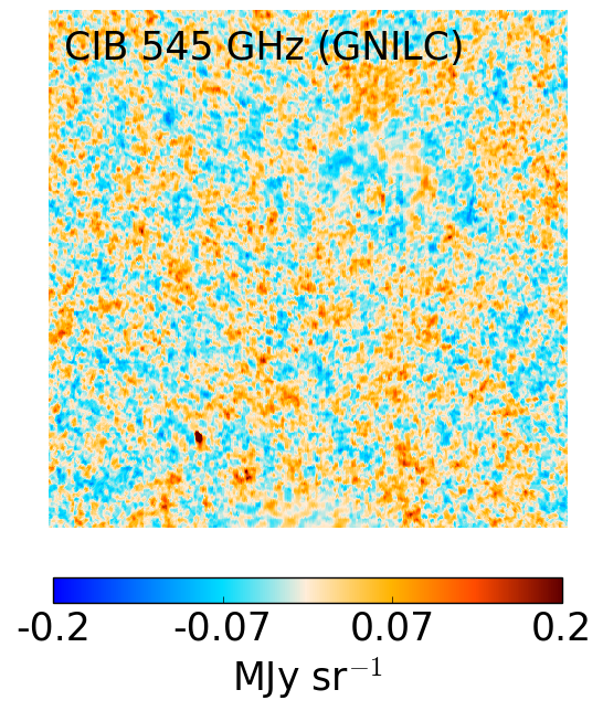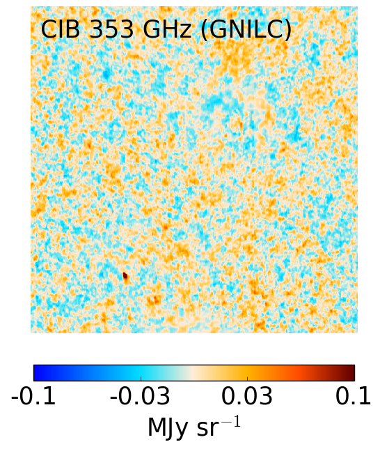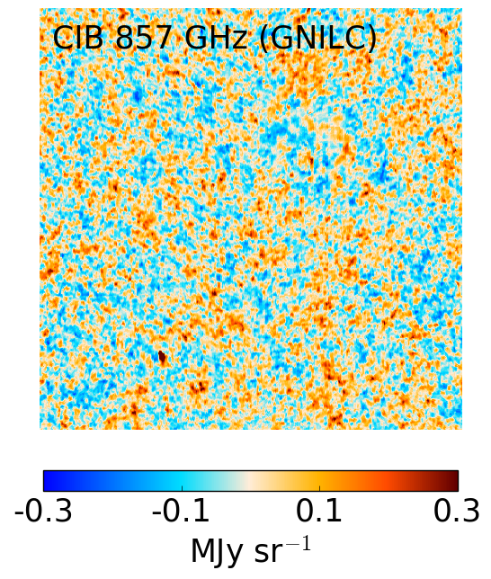 GNILC CIB maps at 353 GHz (left), 545 GHz (middle), and 857 GHz (right) on a