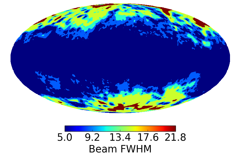 Effective beam FWHM of the GNILC dust maps on the whole sky (top panel) and on a