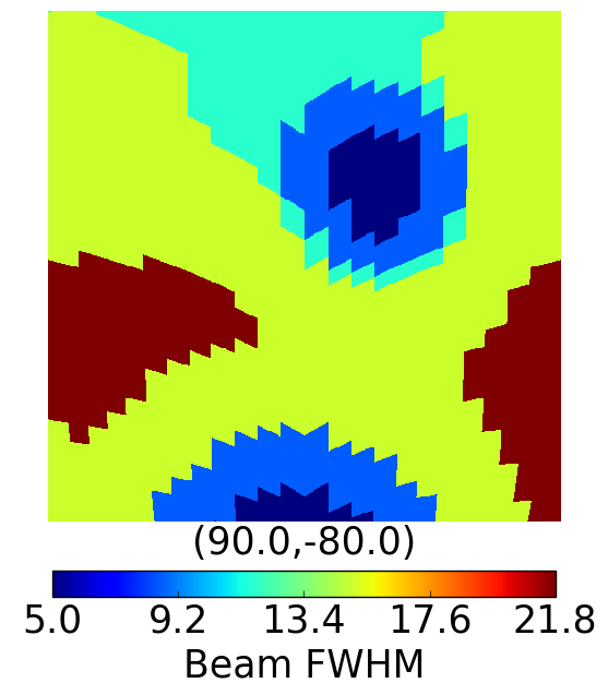 area of the sky centred at high latitude (l,b) = (90°,−80°) (bottom panel). The spatially varying beam FWHM is the same for all frequencies. GNILC preserves the 5′-scale power of the thermal dust in the high signal-to-noise regions of the sky.