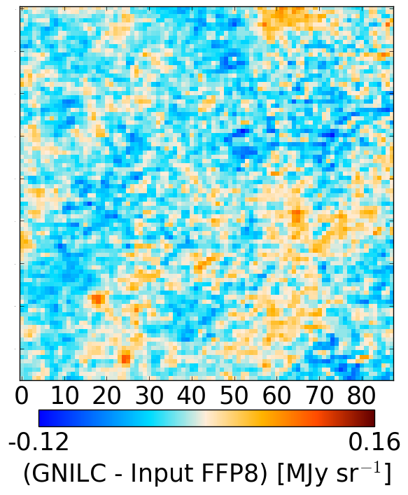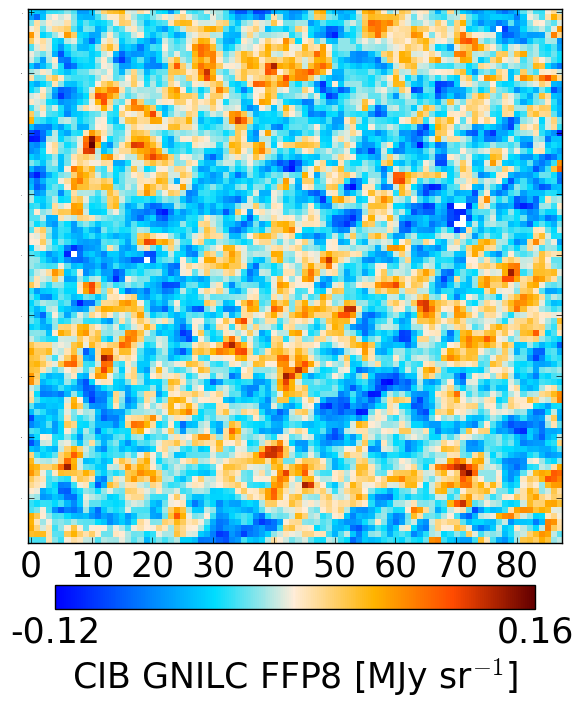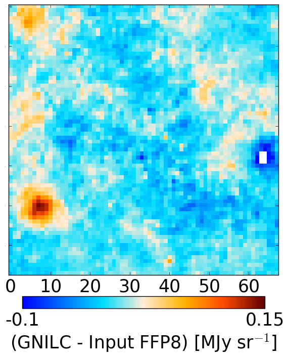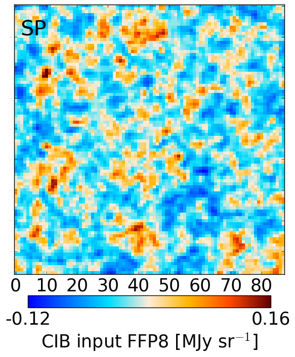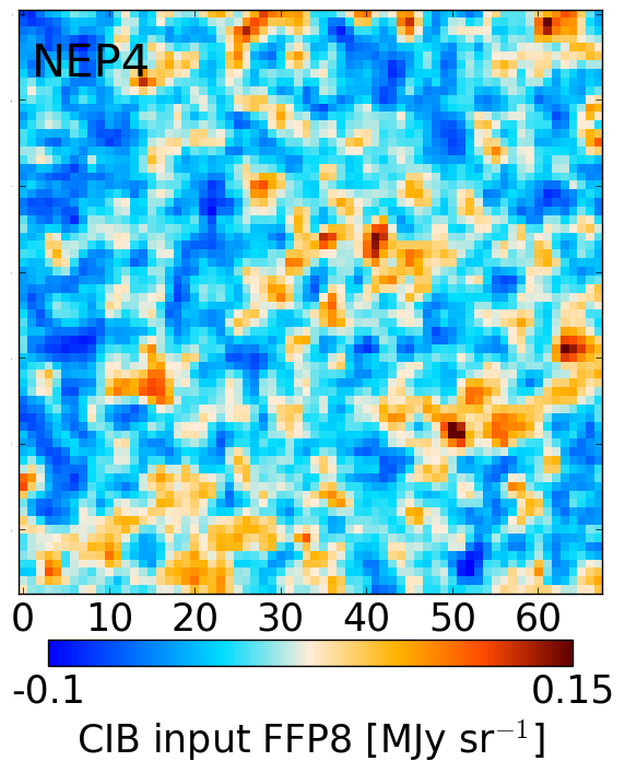 CIB maps from the FFP8 simulations. Input CIB FFP8 (left), GNILC CIB FFP8 (middle), difference (GNILC – input) (right). The fields are: NEP4 (top) and SP (bottom).
