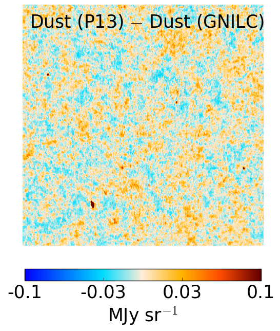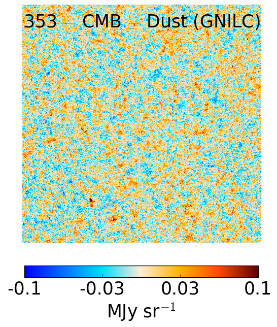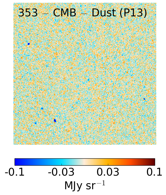 gnomonic projection of the sky centred at high latitude, (l,b) = (90°,−80°). Left: difference map (Planck 353 GHz −Planck CMB −GNILC dust) reveals the CIB anisotropies at 353 GHz. Middle: difference map (Planck 353 GHz – Planck CMB – dust model P13) revealing only the instrumental noise because the dust model P13, like the Planck observations at 353 GHz, still contains the CIB signal. Right: difference (dust model P13 – GNILC dust) revealing the amount of CIB contamination in the dust model P13 with respect to the GNILC dust map. In these images, the local mean intensity of each map has been subtracted.