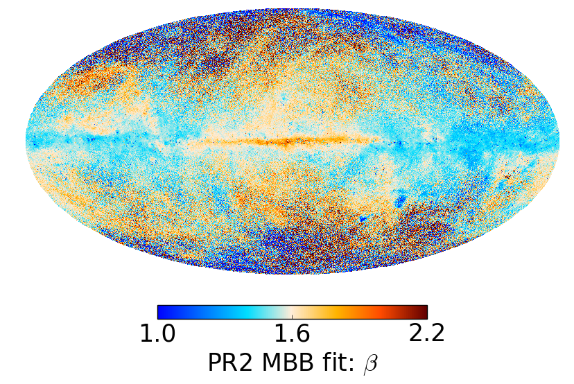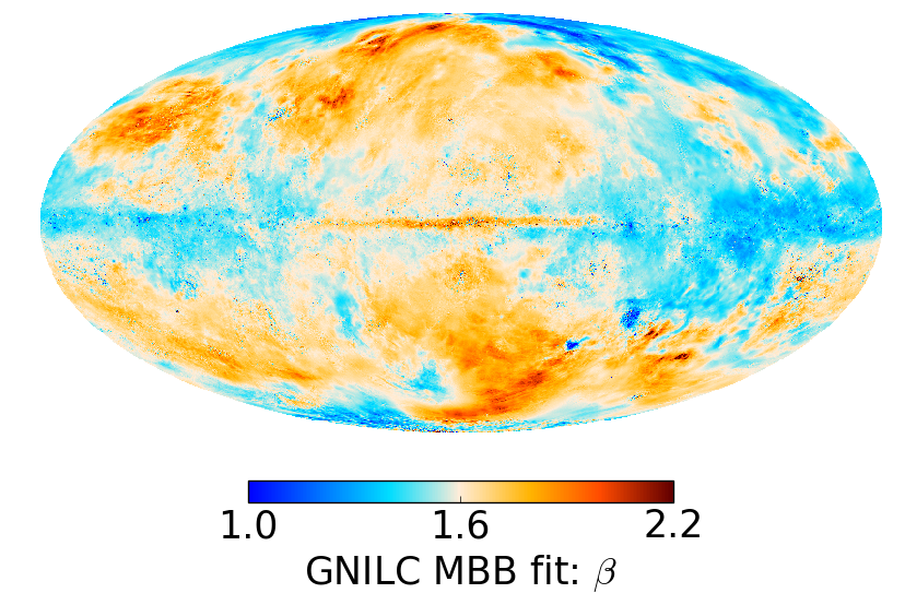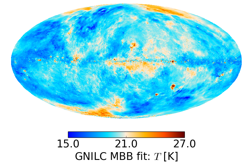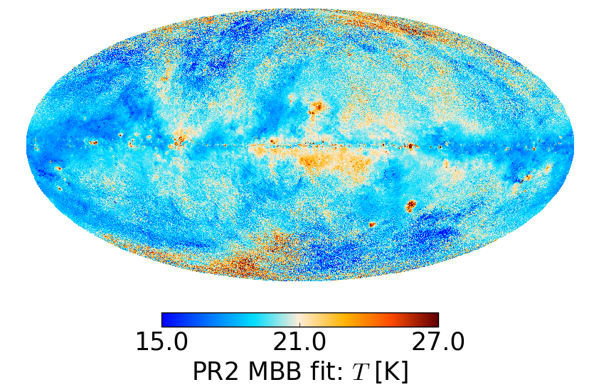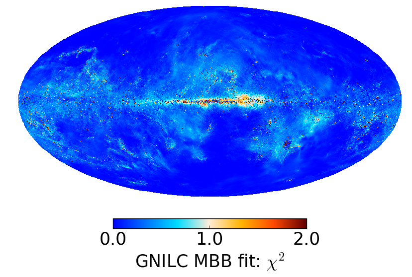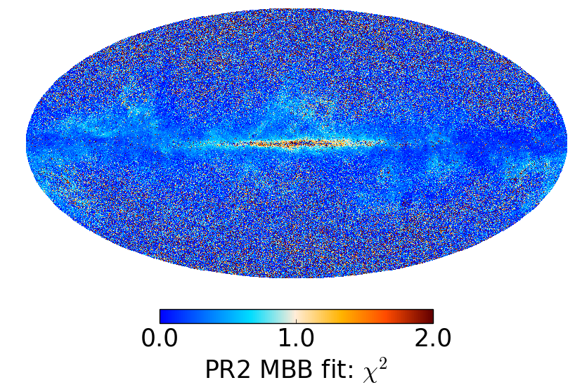 Full-sky thermal dust parameter maps: temperature (top row), spectral index (middle row), and map of the χ2 statistic of the fit (bottom row). Left panels: GNILC modified blackbody (MBB) fit. Right panels: PR2 modified blackbody (MBB) fit a la model P13.