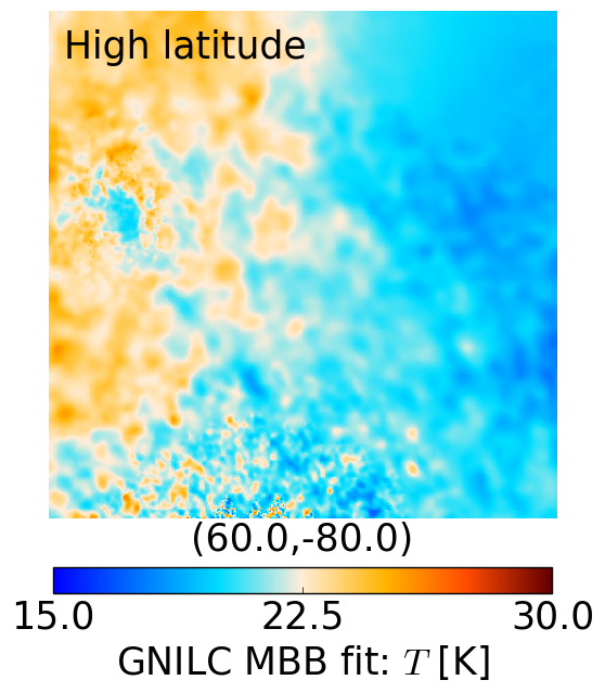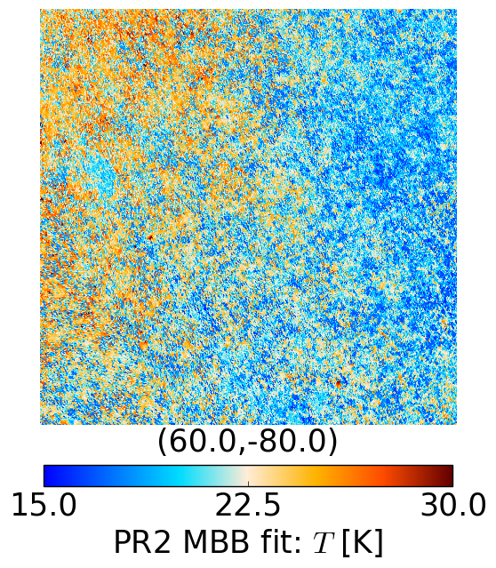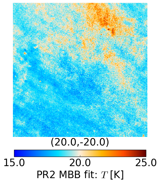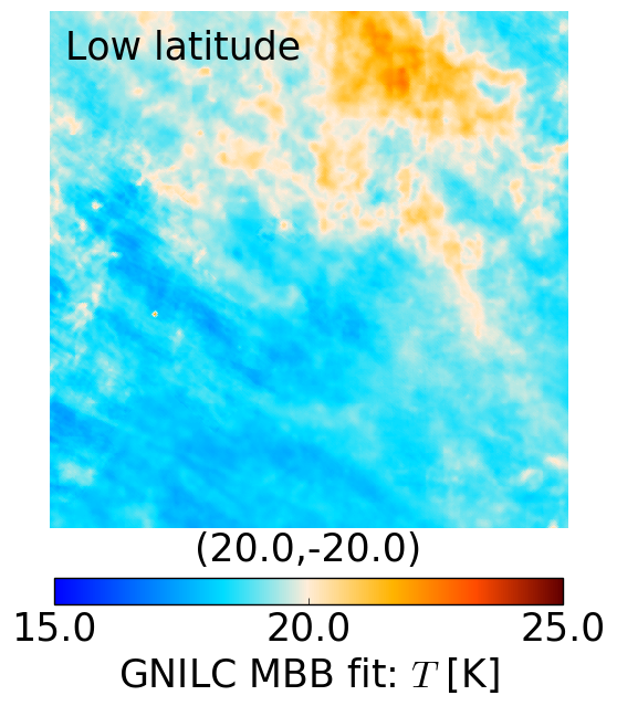 gnomonic projections of the dust temperature maps at high latitude, b = −80° (top panels) and low latitude, b = −20° (bottom panels). Left: GNILC MBB fit. Right: PR2 MBB fit according to model P13.