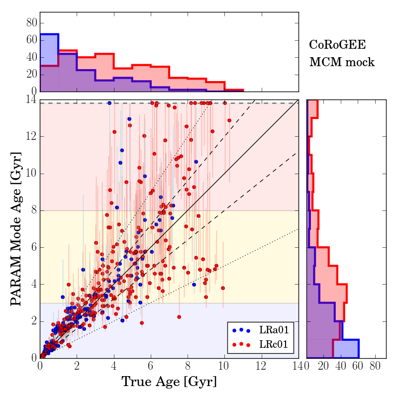 Estimating systematics of our age estimates using simulated stars. The scatter plot in the upper panel shows estimated PARAM ages of the CoRoGEE mock stars (and their statistical 1σ uncertainties as error bars) vs. the true ages of the parent N-body particle. The histograms to the sides of this plot show the corresponding age distributions of the two CoRoT fields. The background colours correspond to the three age bins used in Sect. 4. The lower plot shows the relative age error  as a function of the true age. The black symbols correspond to the median age error in each age bin indicated on the x axis. The various lines correspond to a one-to-one relation, 20% and 50% deviation, and the age boundary at 13.8 Gyr.