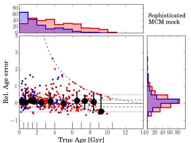 as a function of the true age. The black symbols correspond to the median age error in each age bin indicated on the x axis. The various lines correspond to a one-to-one relation, 20% and 50% deviation, and the age boundary at 13.8 Gyr.