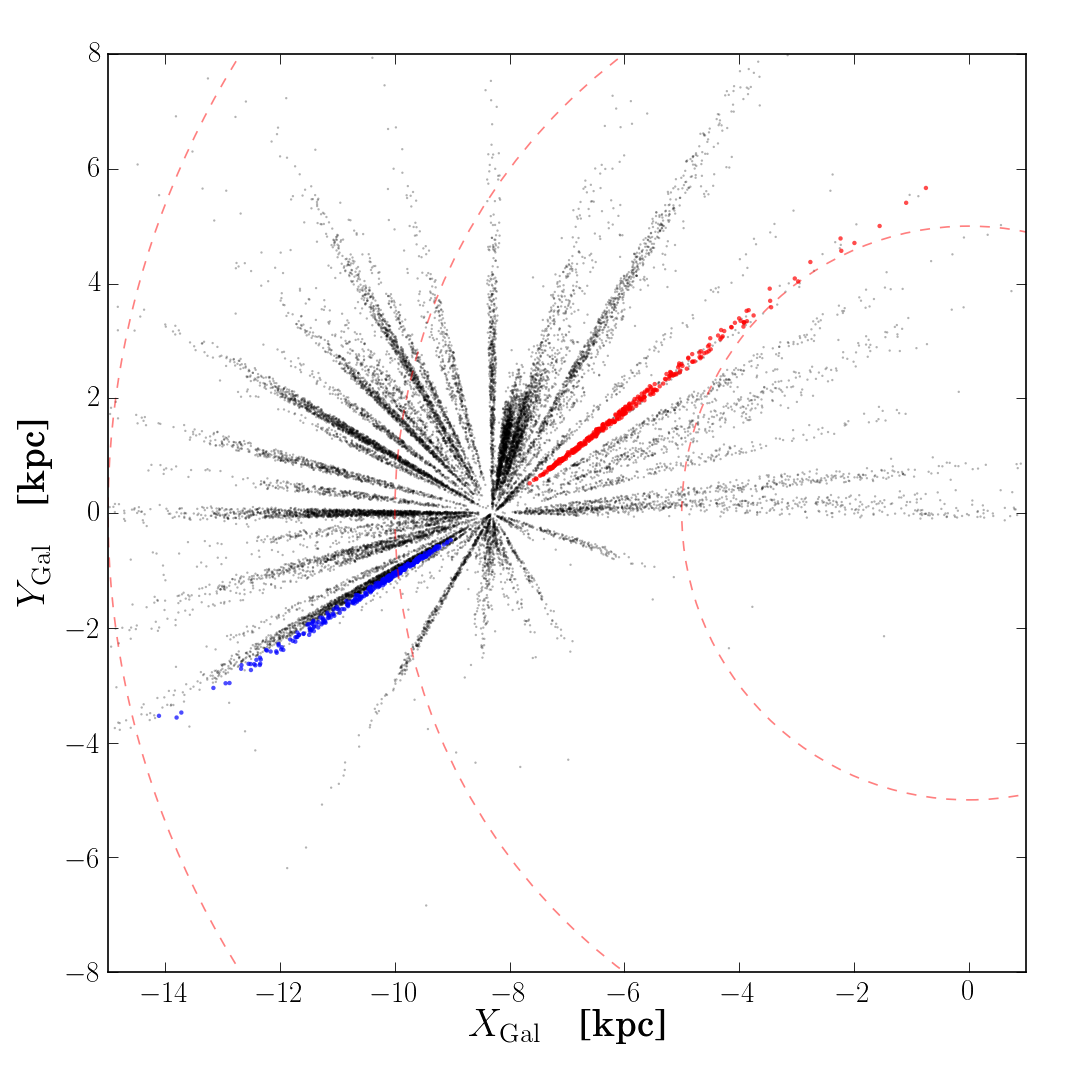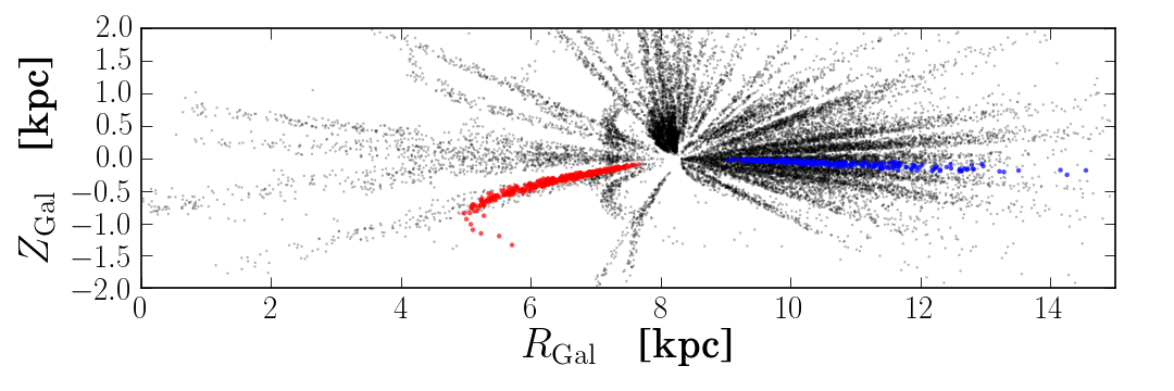 Location of the CoRoT-APOGEE stars in Galactocentric Cartesian coordinates (XGal,YGal – top panel) and cylindrical coordinates (RGal,ZGal – bottom). Blue dots correspond to LRa01 targets, red dots to LRc01 targets. The APOGEE DR10 high-quality giant sample (Anders et al. 2014) is shown in the background (black dots).