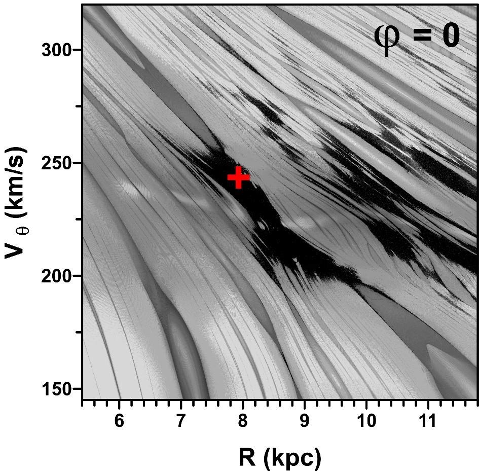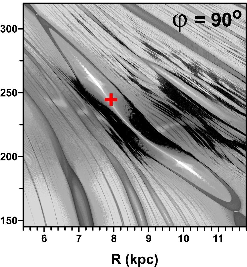 Left: dynamical map of the neighbourhood of the co-rotation point calculated with the variables pR and ϕ fixed at zero. The red cross shows the position of the SSP integrated backwards until pR = 0. Right: same as in the left graph, except ϕ = 90°. Comparing the graphs, we note that the star would be inside the co-rotation resonance island or in a very chaotic area, depending on the angle ϕ.