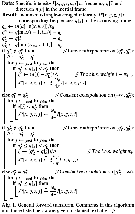 (18)We note that Eqs. (8)–(9) in Leenaarts et al. (2012b) contain two mistakes. First, both signs before n·u/c have to be inverted. Second, the subscript “r” of νr in Eq. (8) has to be dropped. We give the correct transforms here in Eqs. (16)and (18).