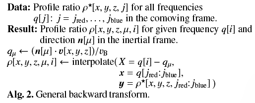 At each grid point (x,y,z), for each direction n [μ], we compute the Doppler shift qμ. The comoving knots n are Doppler-shifted along the inertial knots m by s intervals of δq length and a fractional remainder r such that