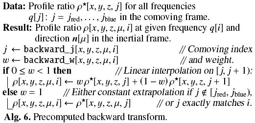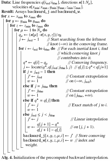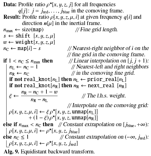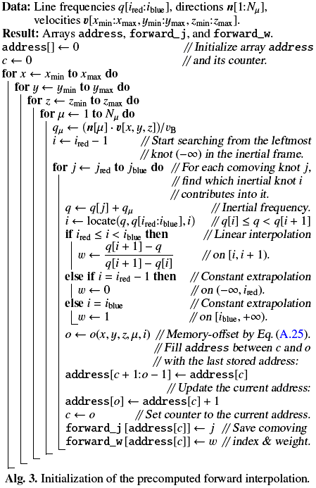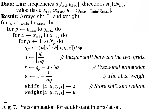 The general algorithm given in Sect. A.2 is slow because for each x, y, z, μ, and i we perform two linear searches in the forward transform and a correlated bisection search in the backward transform along the full frequency range j = jred,...,jblue.