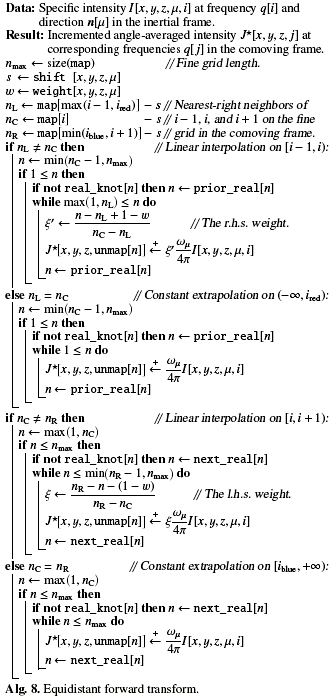 that lies on the inertial interval [ i,i + 1). The extra knot ired−1 corresponds to the comoving frequency −∞ and is needed to treat extrapolation beyond the left end of the frequency grid. For convenience, one more element is added to the address array at the beginning so that the array subscript o starts from −1. Hence, address has NXNYNZNμ(Nν + 1) + 1 elements. The values stored in address start from 0 and are non-decreasing.
