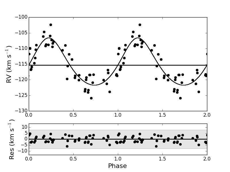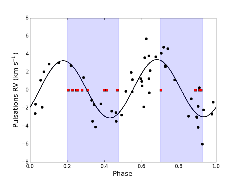 Top: original radial velocity data of HP Lyr fitted with a Keplerian orbit folded on an orbital period of 1650 d and eccentricity of 0.2. Middle: pulsations in the radial velocity folded on a period of 136 d. The red squares and the purple shaded region display the positions in the phase plot where the shocks occur. Bottom: pulsation cleaned orbit folded on a period of 1631 d with an eccentricity of 0.17.