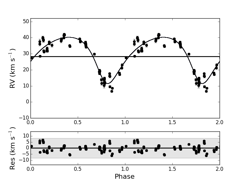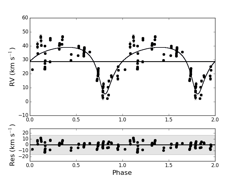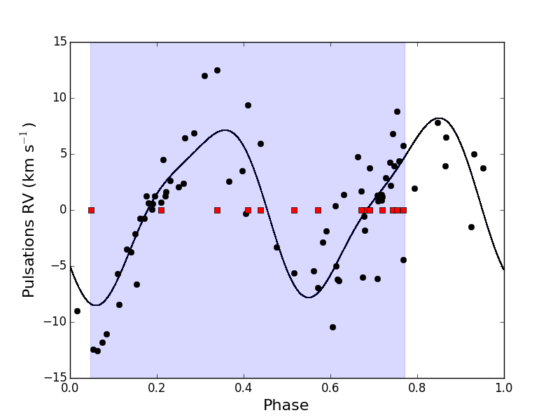 Top: original radial velocity data of IRAS 09144−4933 fitted with a Keplerian orbit folded on an orbital period of 1640 d and eccentricity of 0.4. Middle: pulsations in the radial velocity folded on a period of 100 d. The red squares and the purple shaded region display the position in the phase plot where the shocks occur. Bottom: pulsation cleaned orbit folded on a period of 1683 d with an eccentricity of 0.45.