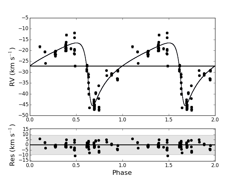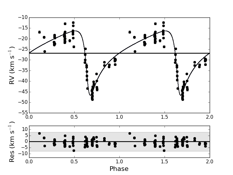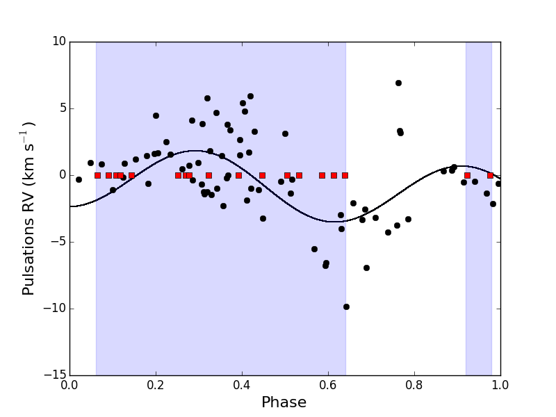 Top: original radial velocity data of IRAS 17038−4815 fitted with a Keplerian orbit folded on an orbital period of 1393 d and eccentricity of 0.6. Middle: pulsations in the radial velocity folded on a period of 37.3 d. The red squares and the purple shaded region display the position in the phase plot where the shocks occur. Bottom: pulsation cleaned orbit folded on a period of 1386 d with an eccentricity of 0.57.