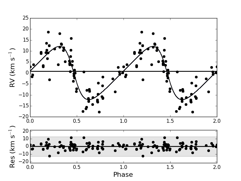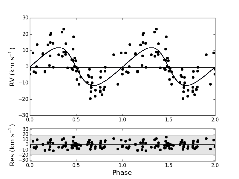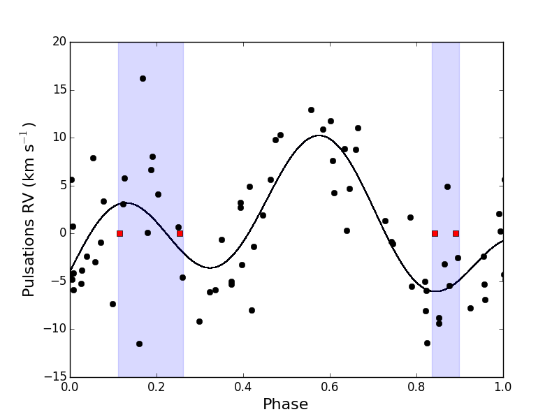 Top: original radial velocity data of DY Ori fitted with a Keplerian orbit folded on an orbital period of 1244 d and eccentricity of 0.3. Middle: pulsations in the radial velocity folded on a period of 60.8 d. The red squares and the purple shaded region display the positions in the phase plot where the shocks occur. Bottom: pulsation cleaned orbit folded on a period of 1230 d with an eccentricity of 0.2.