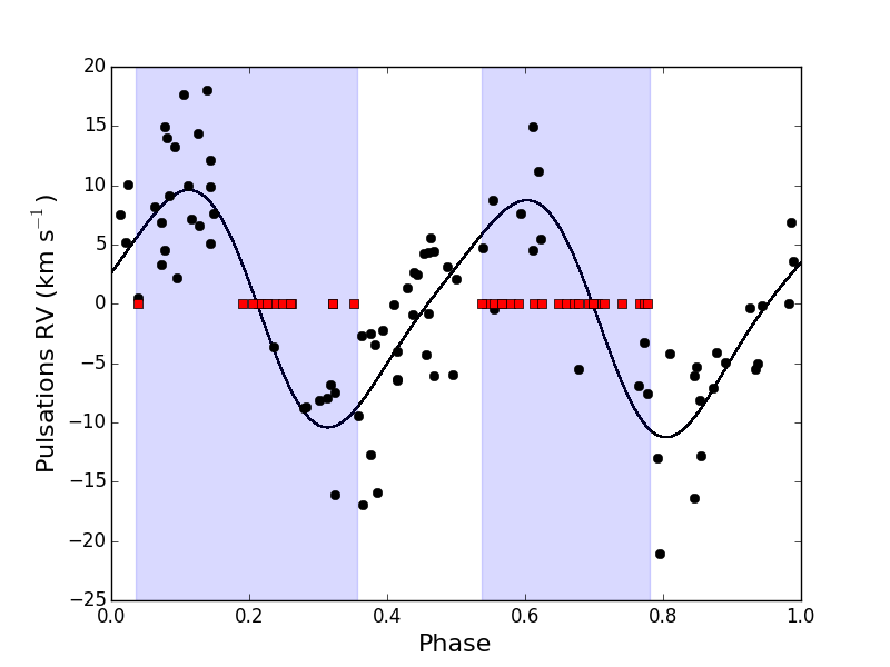Top: original radial velocity data of TW Cam fitted with a Keplerian orbit folded on an orbital period of 655 d and eccentricity of 0.3. Middle: pulsations in the radial velocity folded on a period of 86.4 d. The red squares and the purple shaded region display the positions in the phase plot where the shocks occur. Bottom: pulsation cleaned orbit folded on a period of 654 d with an eccentricity of 0.2.