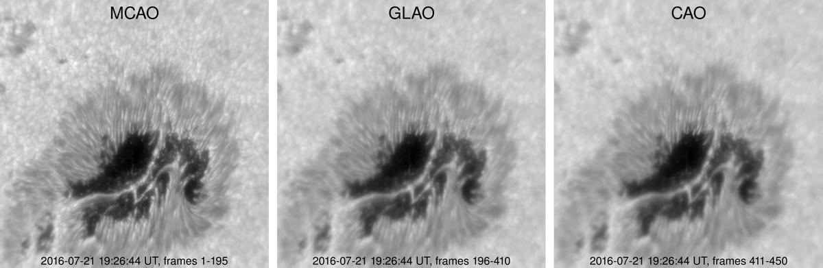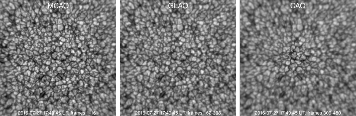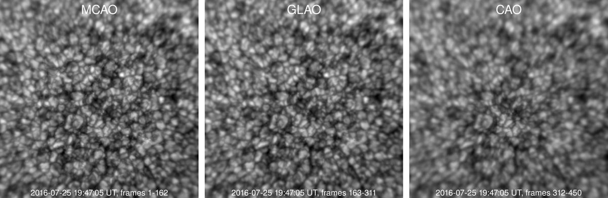 The Sun observed in a field of view of 53′′ × 53′′ with MCAO, GLAO, and CAO correction with Clear on the NST. The top row shows a quiet region of the Sun between 10:49:45 and 10:50:16 PDT on July 27, 2016. The center row shows a sunspot in active region NOAA 12567 on July 21, 2016, between 12:26:44 and 12:27:24. Both bursts were taken with a TiO filter (705.7 ± 0.5 nm). The bottom row shows the quiet Sun in G band (430.5 ± 0.25 nm) between 12:47:05 and 12:47:36 on July 25, 2016. Each image shows the sum of the frames within a block with MCAO (left), GLAO (middle), and CAO (right) correction in a continuous burst of 450 frames recorded. Exposure time was 1.6 ms for the granulation bursts and 11 ms for the sunspot. Real-time movies are available online.