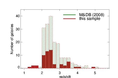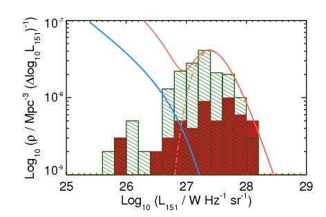 Distribution of our targets in redshift (left) and radio power (right). In both panels, the red solid and dark green hatched histograms show our sample and the parent sample of all known powerful radio galaxies at z ≥ 2 from Miley & De Breuck (2008), respectively. The gap between z = 2.6 and z = 2.9 in the left panel is because no bright optical emission lines fall into the near-infrared atmospheric windows at these redshifts. The light blue and light red lines in the right panel show the luminosity function of powerful radio galaxies at redshifts z = 0 and z = 2 from Willott et al. (2001), respectively. The dot-dashed light red line highlights their high-power “high-z” population (for details see Willott et al. 2001).