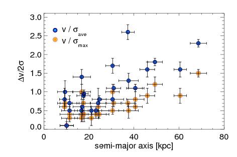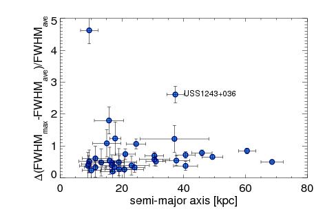 The ratio of bulk to turbulent velocity (parametrized as Δv/ 2σ, see Sect. 7.5) in the 25 sources with extended gas in Table 4 scales with the size of the emission-line region (top panel). We plot Δv/ 2 instead of Δv, because this gives an approximation to the circular velocity in case of rotationally dominated motion. The offset between maximal and average FWHM does however not depend on the source size (bottom panel).