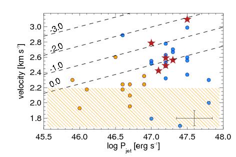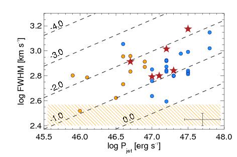Gas velocity as a function of the jet power following Wagner et al. (2012). The left panel shows FWHM line widths, the right panel approximates a putative radial outflow velocity by showing one half of the measured velocity offsets. Blue and orange symbols show the radio galaxies of the present analysis, and those of Collet et al. (2016), respectively. Red stars show galaxies with measured Eddington ratios from Nesvadba et al. (2011b). The black dashed lines show jet powers corresponding to Eddington ratios between 10-4 and unity. The yellow hatched area shows the range spanned by the mass selected sample of galaxies without prominent radio source of Buitrago et al. (2014).