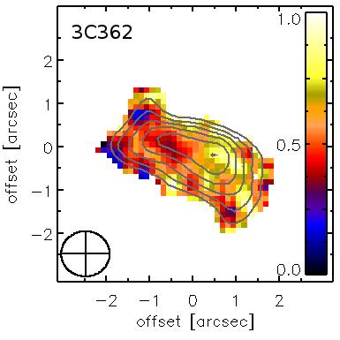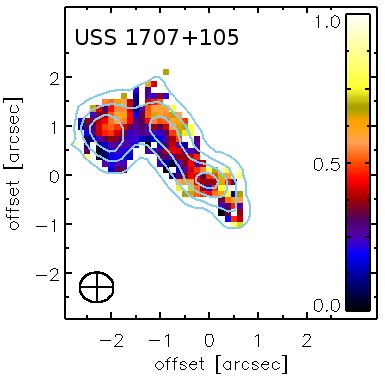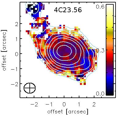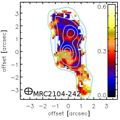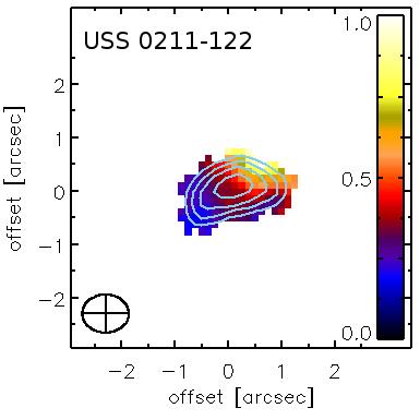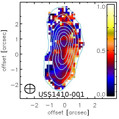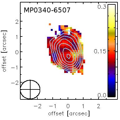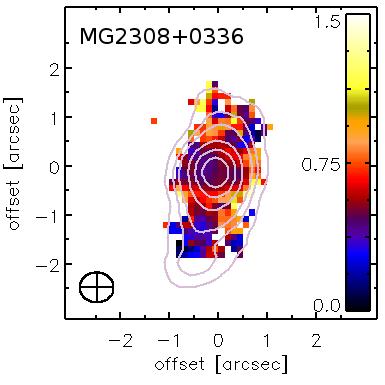 Ratios of Hα to [OIII]λ5007 for nine galaxies with extended emission-line regions and at redshifts where we cover both lines with our SINFONI data cubes. Contours show the [OIII]λ5007 morphology. The ellipse in the lower left corner illustrates the size of the seeing disk.