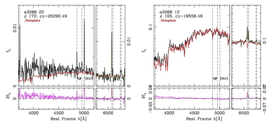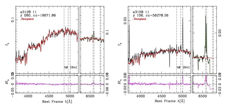 Examples of ELG spectra. Top left: the high-ionization Hii galaxy WINGS J043319.43-614141.8; the TO WINGSJ043021.56-612848.7; bottom left: the LINER WINGSJ032933.77-522659.6; bottom right the Seyfert 2 galaxy WINGSJ034144.52-534221.1. Red lines trace the adopted stellar template. All of these sources could be entered in the DD with detected diagnostic ratios and have the probability of proper classification Pi,i ≳ 0.8.
