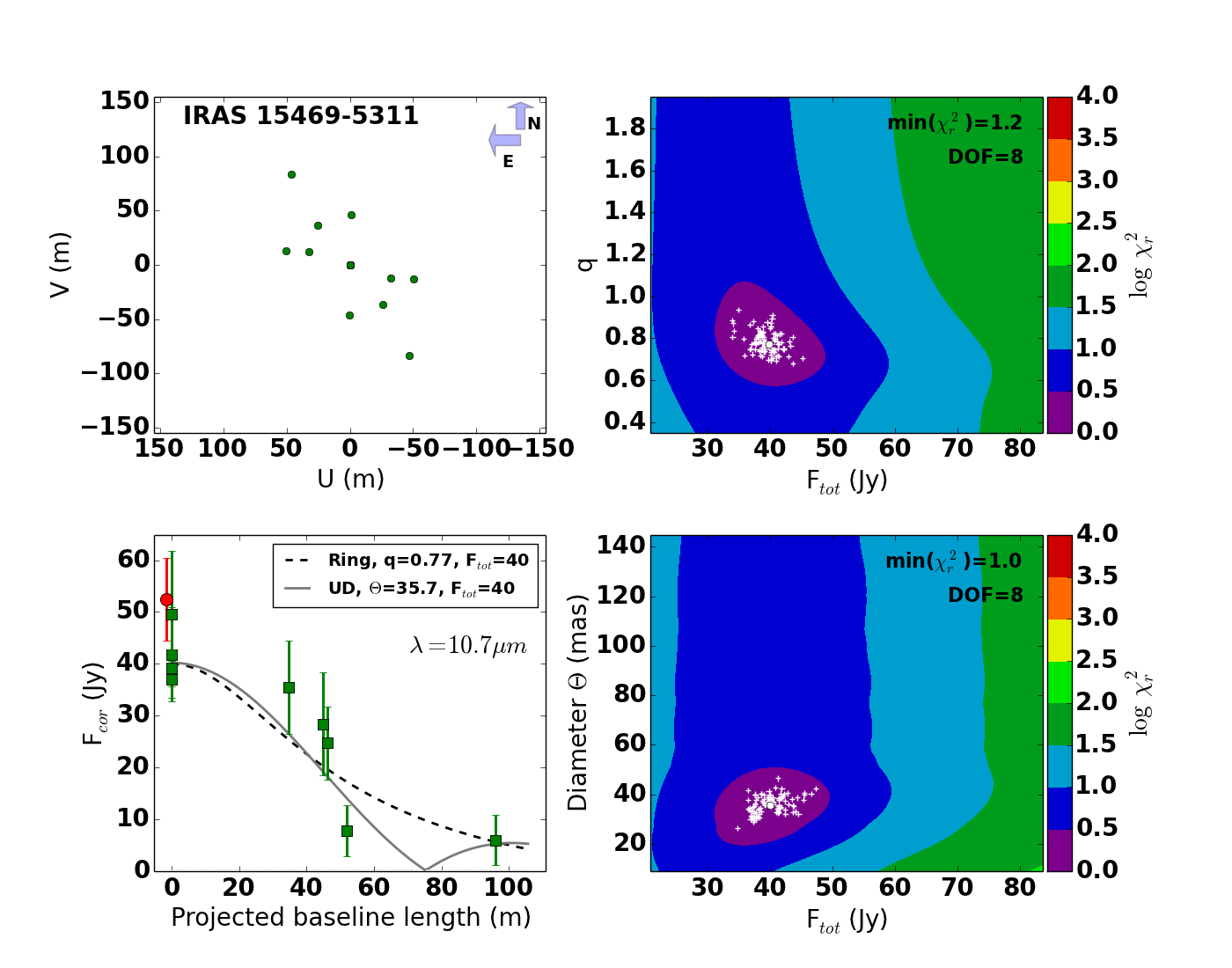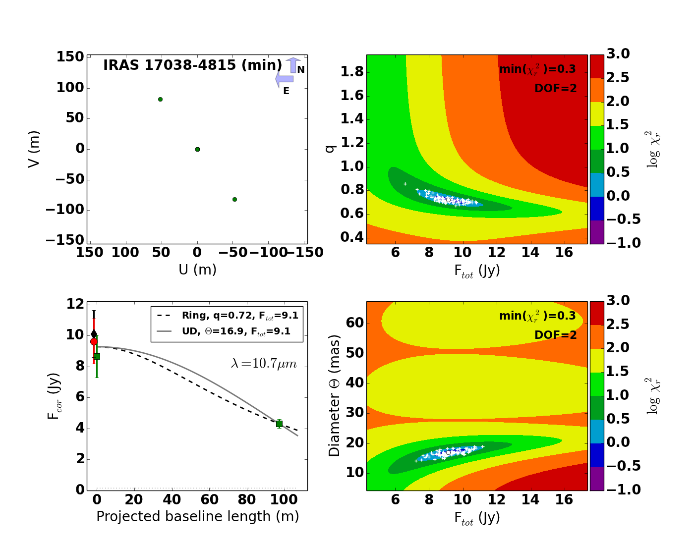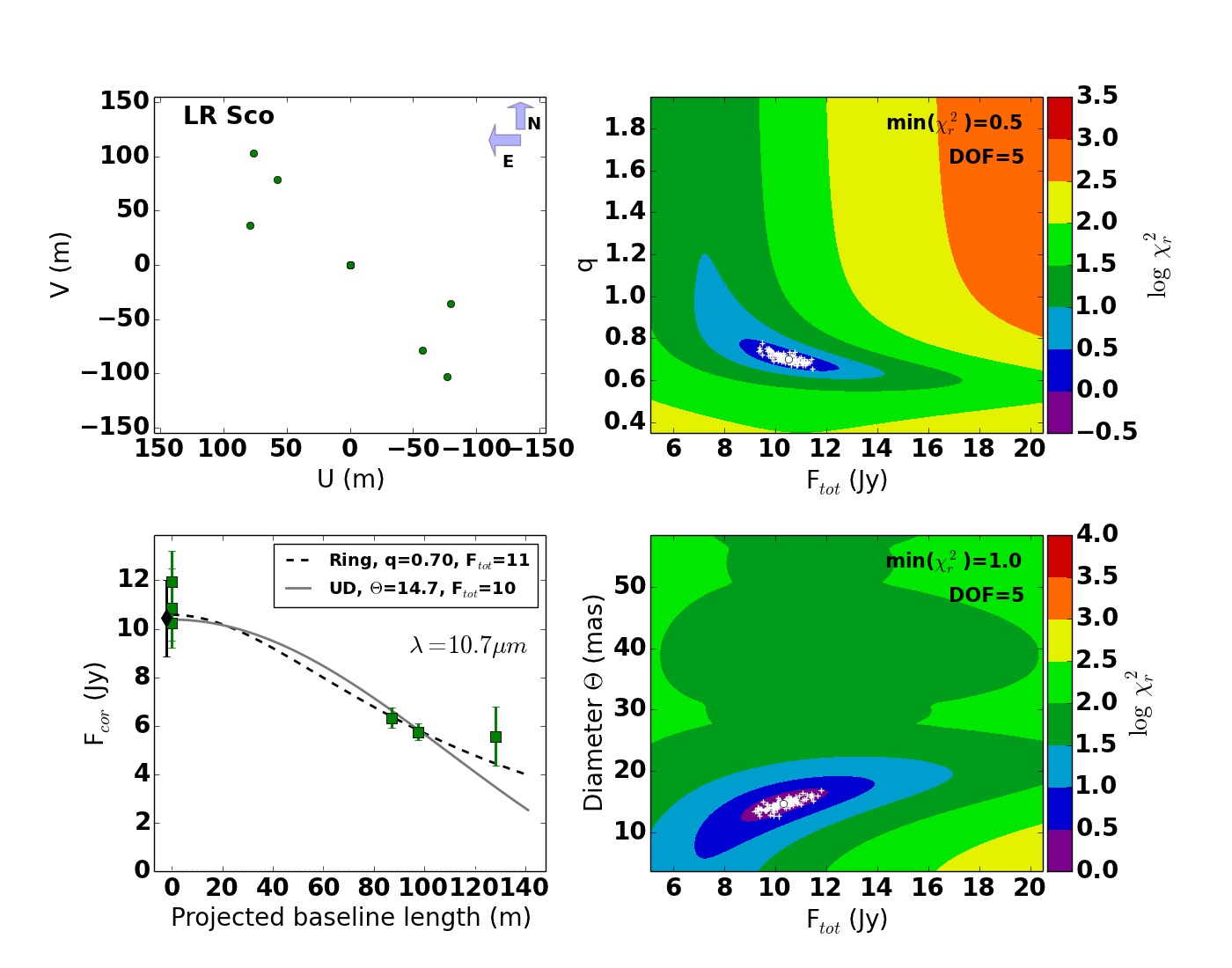 Lower right panel: result for the 89 Her data set with alternative stellar parameters that take the large detected fraction of scattered light into account (Hillen et al. 2013).