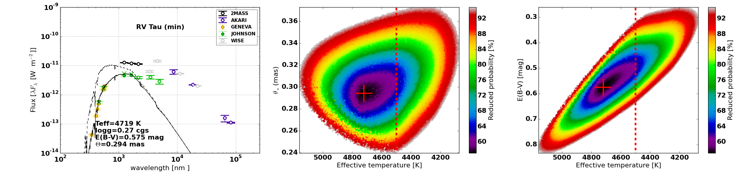 Same as Fig. 2 but for a post-AGB star with strong pulsational variability (RV Tau itself). The upper and lower panels show optical and near-IR photometry at visual maximum and minimum pulsation phases, respectively. For visual reference we also include photometry for which no proper phase attribution can be made (mainly Tycho-2, 2MASS, and all mid- and far-IR data). In some cases these data may correspond to a different RVb phase.