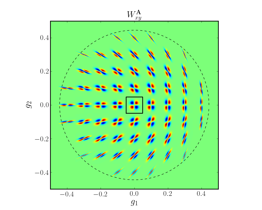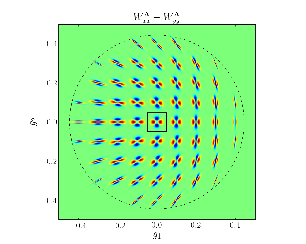 , for filter and PSF size w = 3, p = 2, (κ = 0). Integrating an image multiplied with the filter function for a particular shear (g1,g2) yields the weighted second moments the image would have had if it had been sheared by that amount before seeing convolution. The central box is 25 units on a side, and the dashed line indicates the maximum shear value that can be applied for the given w and p (see Eq. (18)). Red is positive, blue is negative. Left: filters corresponding to Qxx−Qyy. Right: filters corresponding to Qxy.