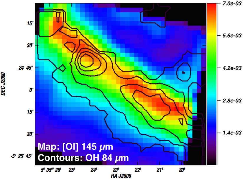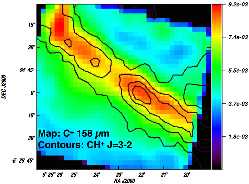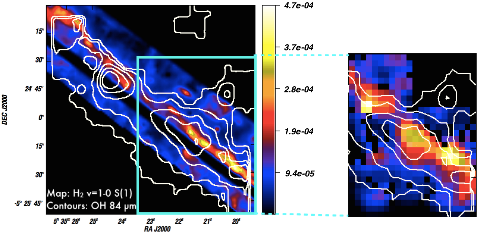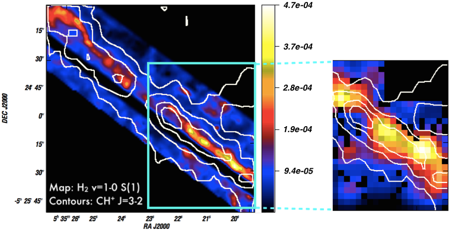 Top row: CH+ 120 μm compared with H2v = 1–0 S(1) and [CII] 158 μm. CH+ 120 μm contours overlaid on the H2 map (left) and [CII] map (right). Zoom: map of vibrationally excited H2 convolved to the spatial resolution of CH+J = 3–2 map including contours of CH+J = 3–2. Bottom row: OH 84 μm compared with H2v = 1–0 S(1) and [OI] 145 μm. OH 84 μm contours overlaid on the H2 map (left) and [OI] map (right). All contours are with contour steps of 20% of the peak emission, except for the zoomed picture where the contours are with contour steps of 10%. The maps are in units of erg s-1 cm-2 sr-1. The H2v = 1–0 S(1) data taken from Walmsley et al. (2000, big map) and van der Werf et al. (1996, zoomed map). The [CII] 158 μm and [OI] 145 μm data were taken from Bernard-Salas et al. (2012).
