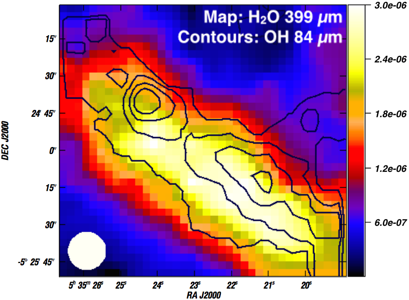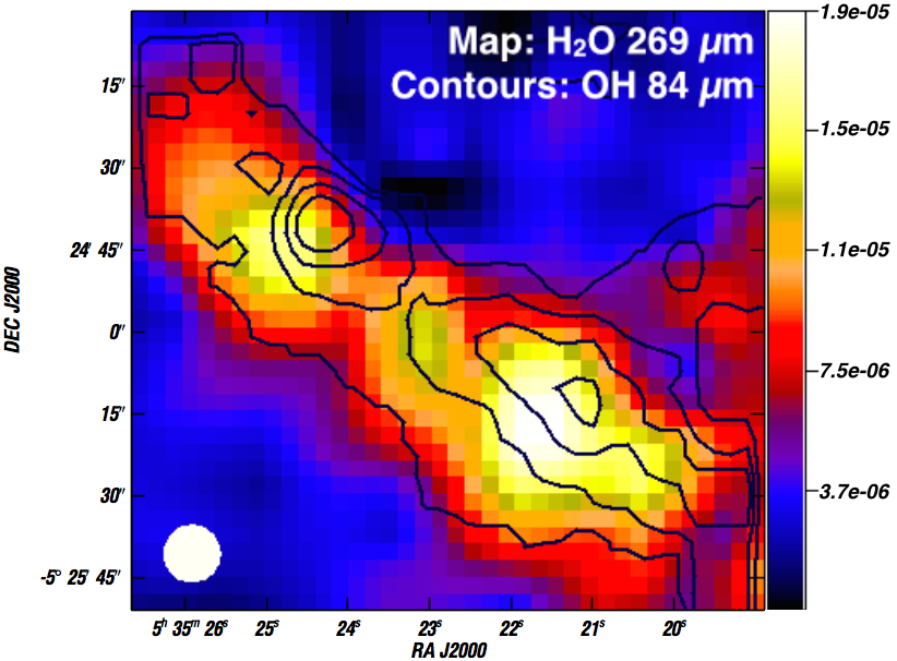 Maps of H2O 111–000 at 269 μm (left) and H2O 211–202 399 μm (right) with contours of OH 84.6 μm with contour steps of 20% of the peak emission. The maps are in units of erg s-1 cm-2 sr-1.