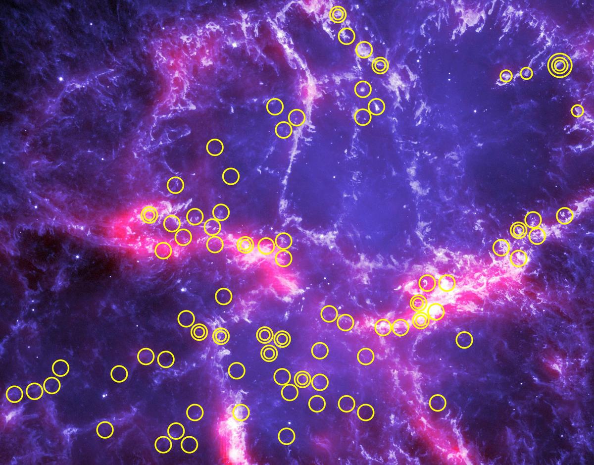 Left: individual globules are marked with circles on this HST optical emission line image (blue-white) combined with a Herschel Space Observatory 70 μm image (red) – credit: HST and Herschel Space Observatory, ESA, NASA. Right: orientations of elongated objects on the background of the HST image shown in Fig. 1.