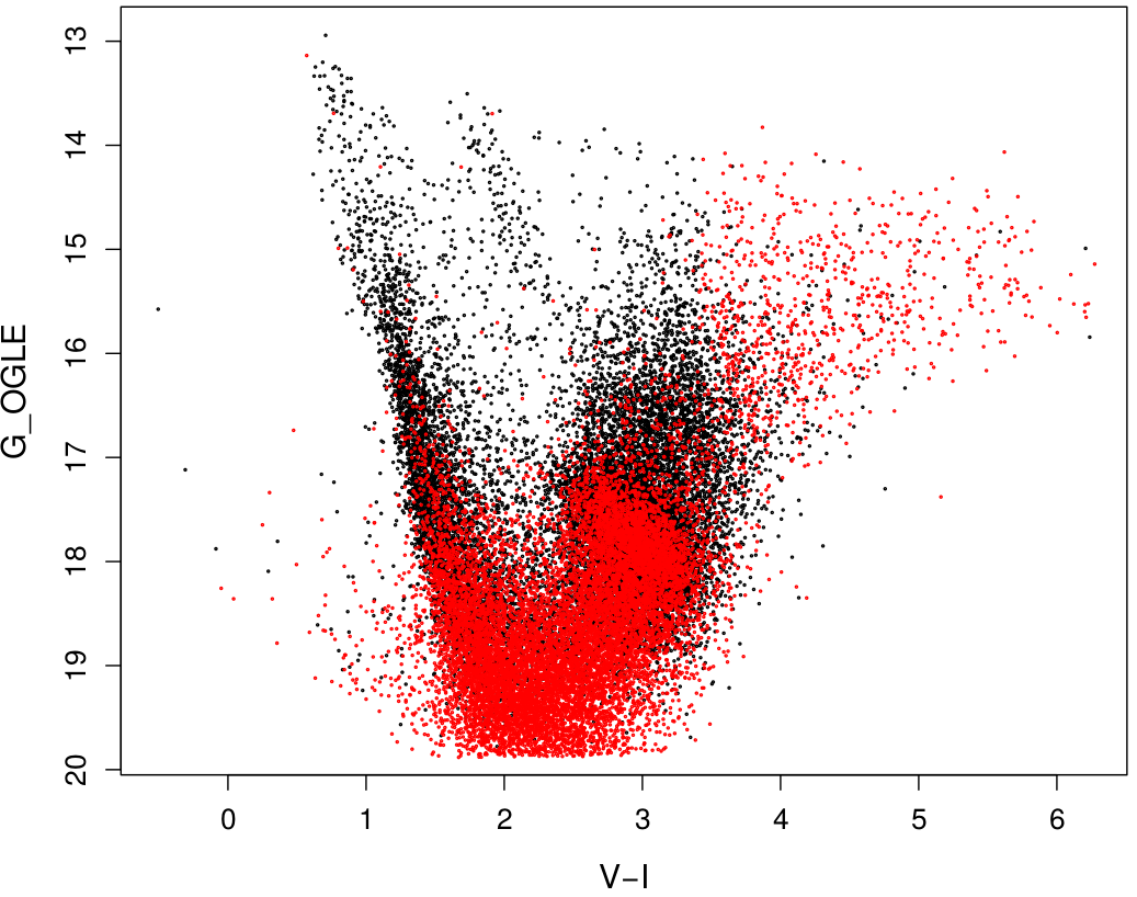 Gaia DR1 completeness vs. some OGLE Catalogues: a) completeness at G = 18 of some OGLE fields as a function of the measured density at G = 20; b) completeness in OGLE Bulge field blg100 (l = −0.3°, b = −1.55°), density: 970 000 stars/deg2; c) associated colour-magnitude diagram (stars in red are missing in Gaia DR1).