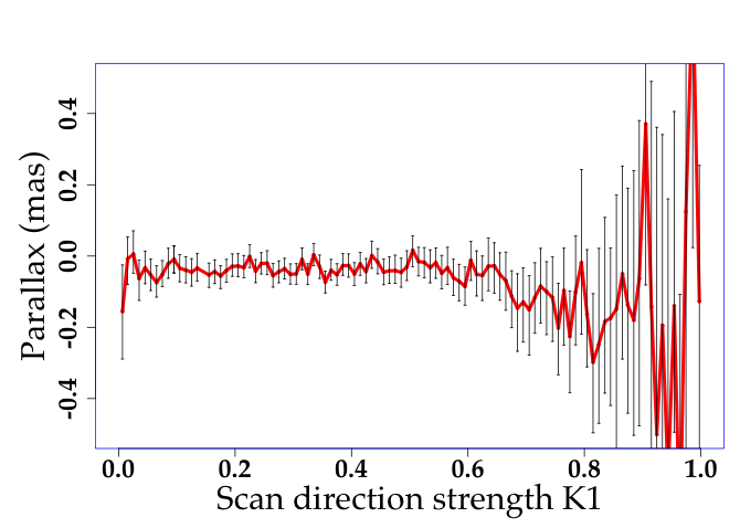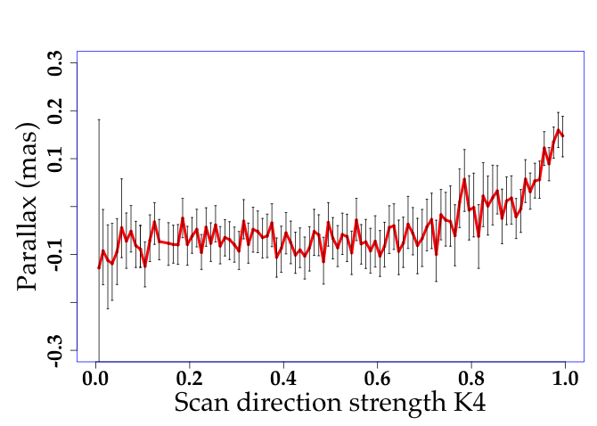 Median quasar parallaxes (mas) vs. scan direction strength K1 (left) and K4 (right).