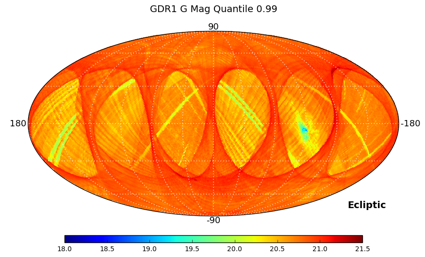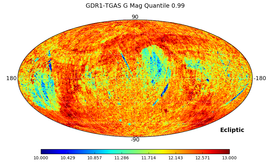 Limiting magnitude: 99th percentile of the G distribution in ecliptic coordinates: a) TGAS; b) full Catalogue.