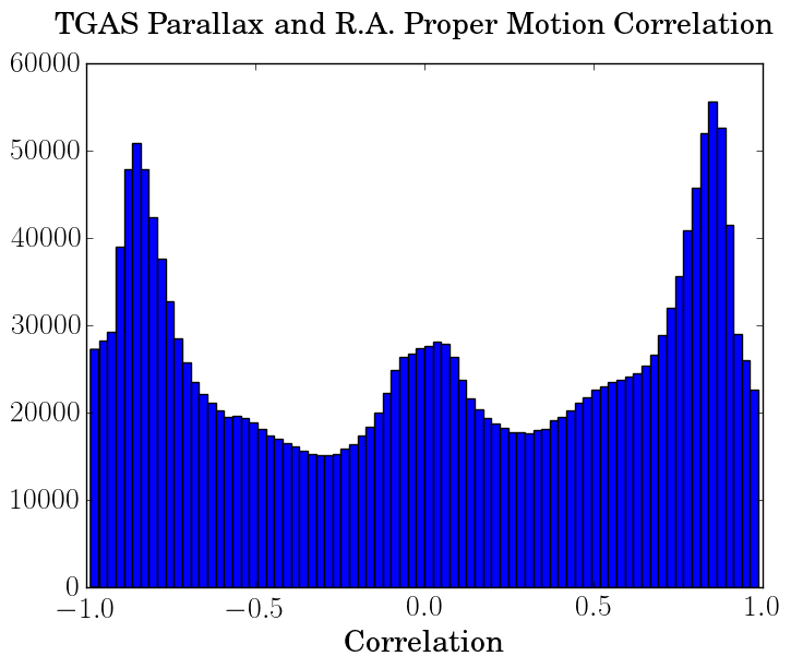 Correlations between proper motion in right ascension and parallax for the whole TGAS data set (left) and for its subset of Hipparcos stars alone (right).